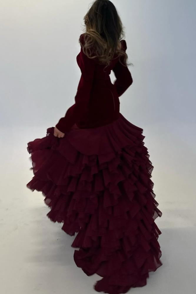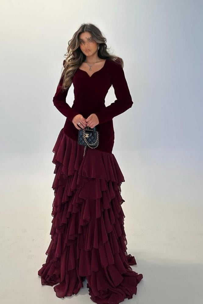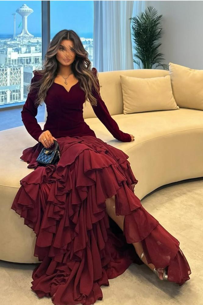 هذا الجمع بين المخمل والساتان يبرز جمال التصميم ويجعله مناسبًا للمناسبات الراقية