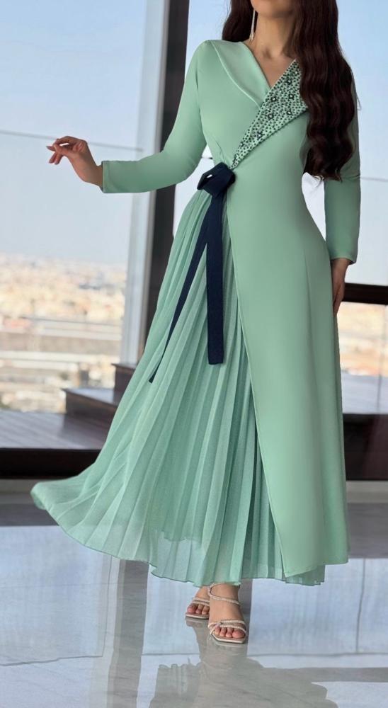 اللون: اخضر تفاحي مع تفاصيل داكنة