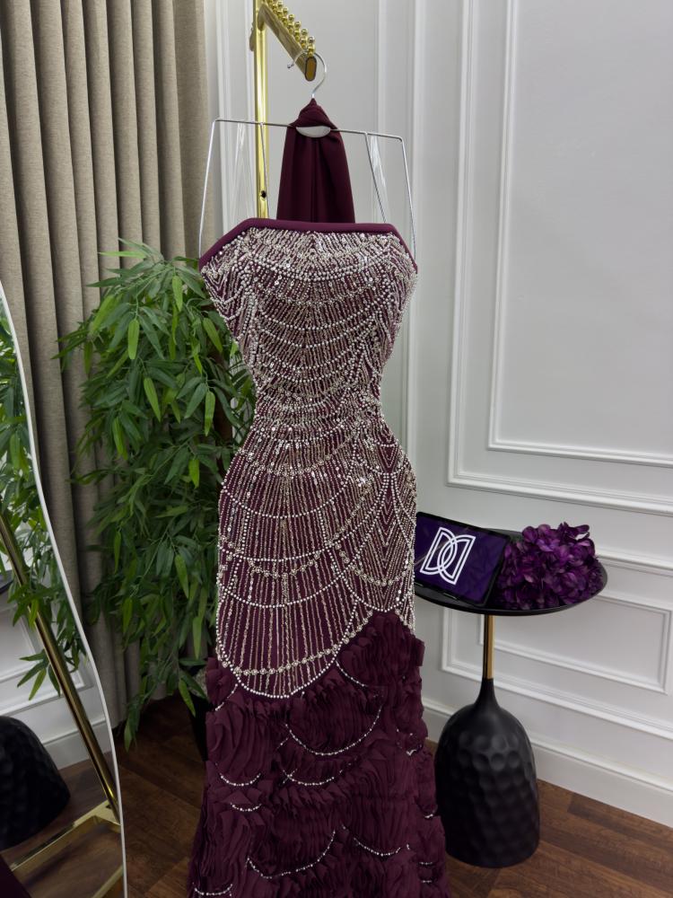 فستان سهرة فاخر بقصة ضيقة تبرز القوام (Bodycon) بلون عنابي غامق