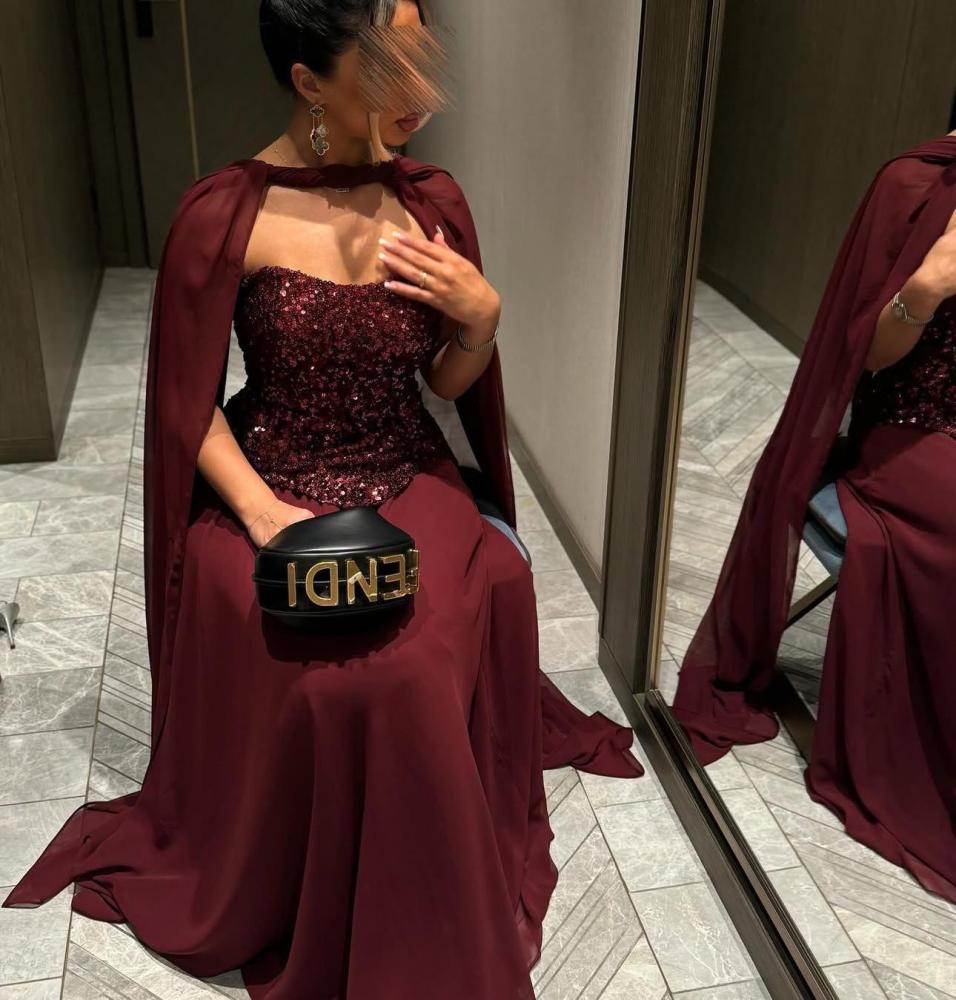 فستان سهرة كم طويل لون عنابي