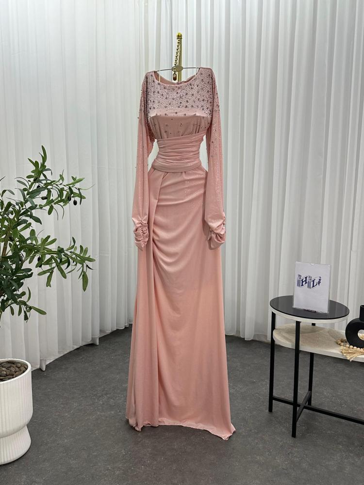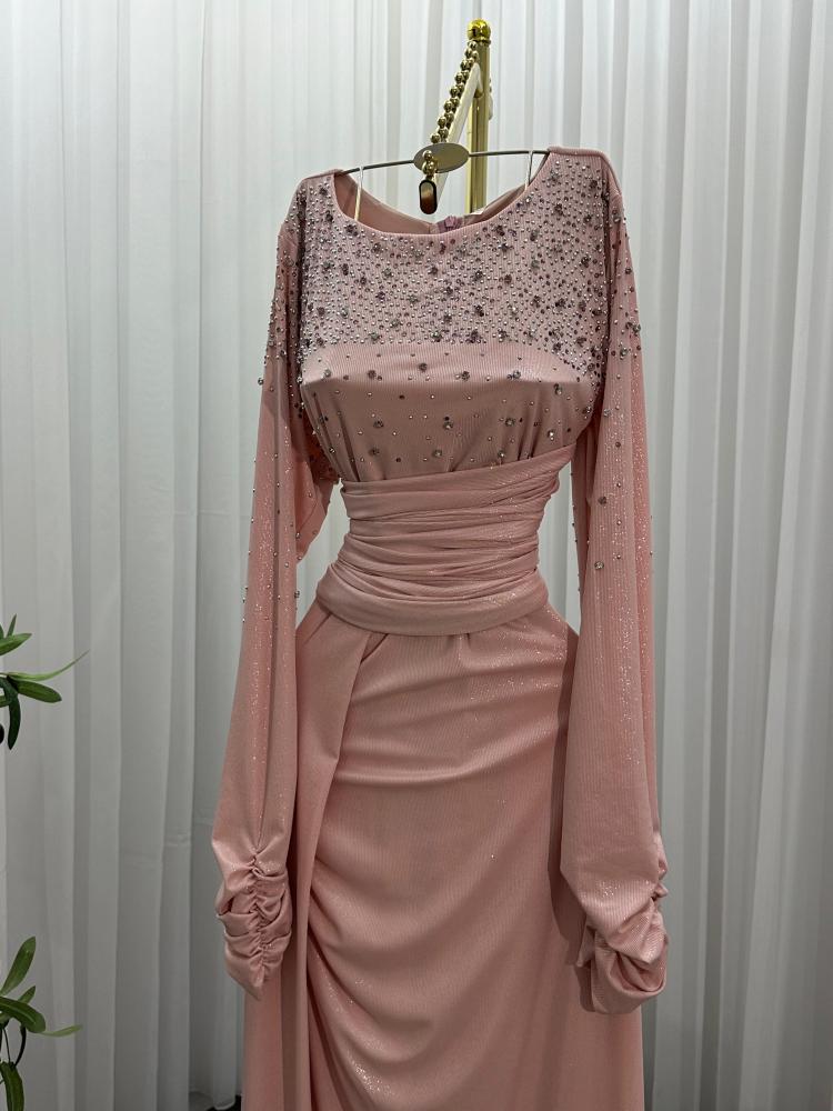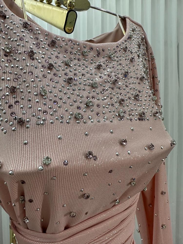 يتميز بتصميم أنيق ومحتشم. الجزء العلوي من الفستان مزين بتطريزات لامعة، وله أكمام طويلة واسعة مع كسرات عند الأطراف. يتميز بخصر ملفوف ينسدل منه تنورة بتصميم درابيه جذاب. فستان مثالي للمناسبات الراقية وحفلات الزفاف