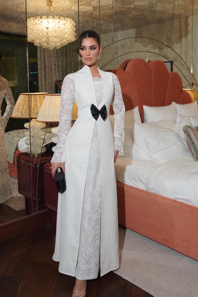 فستان يتميز بتصميم راقٍ وأنيق، حيث يجمع بين البساطة والفخامة. يتكون من طبقتين: الطبقة الداخلية مصنوعة من قماش دانتيل أبيض شفاف، مع أكمام طويلة تضيف لمسة كلاسيكية، بينما الطبقة الخارجية هي سترة طويلة بدون أكمام بنفس اللون الأبيض، مزينة بفيونكة سوداء في المنتصف لتعزز الأناقة.؟.