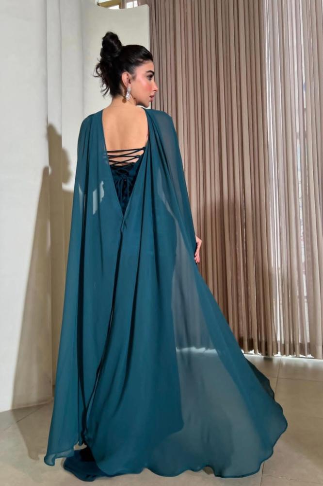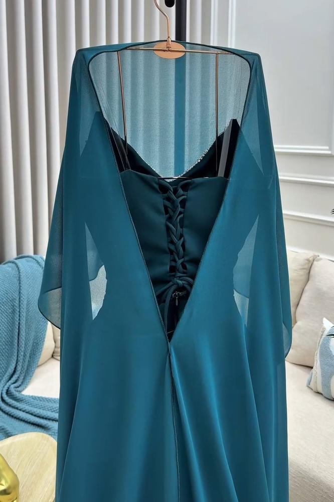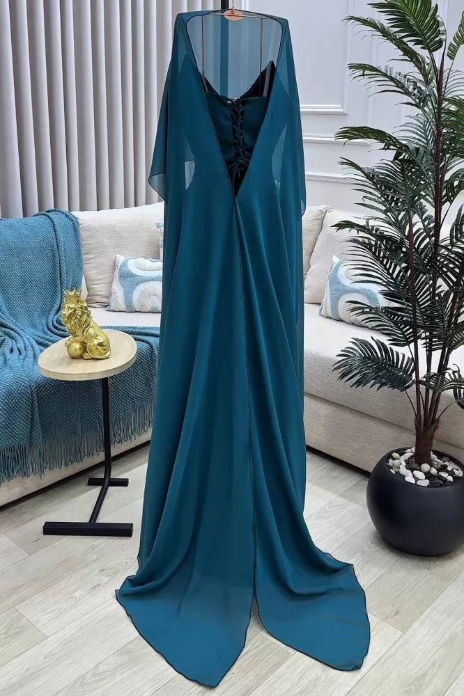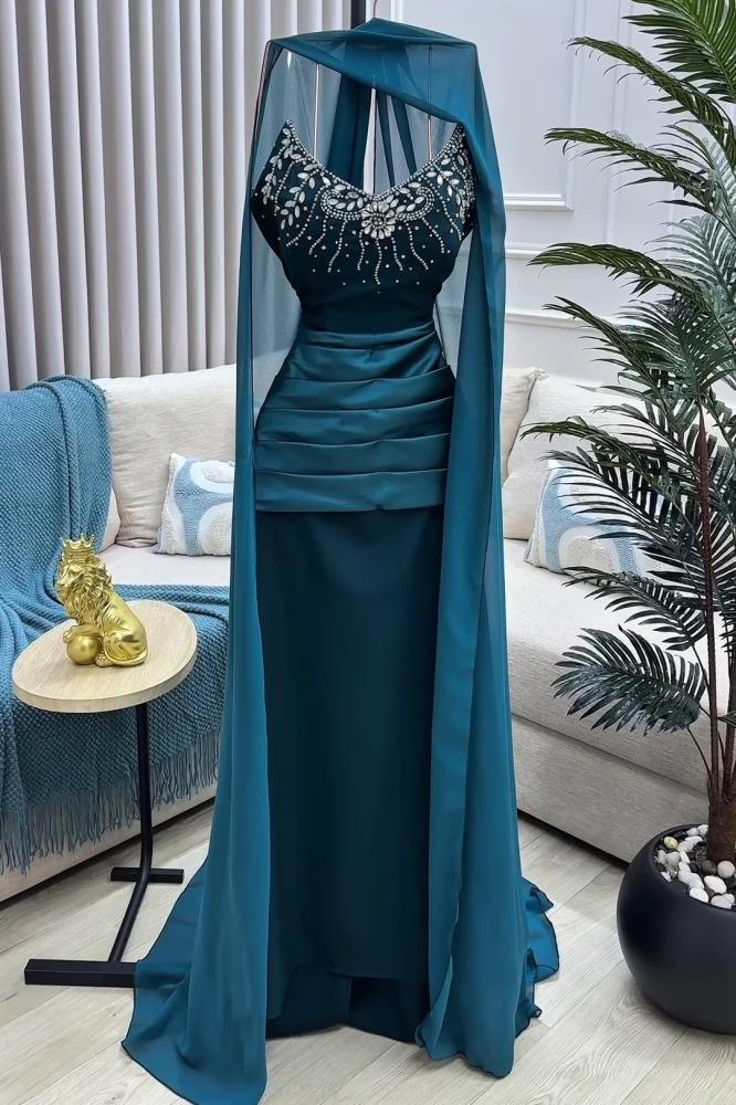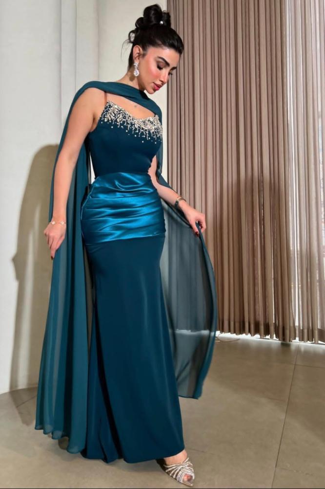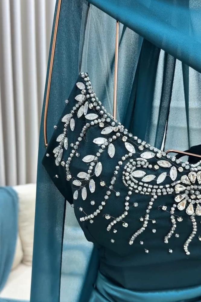 فستان يتميز بتصميم فخم وأنيق بلون الأزرق البحري مزين بتطريزات خرزية متقنة* حول العنق، تضيف لمسة براقة وراقية طويلة ومنسدلة بانسيابية، مما يعزز أناقة التصميم وحركته المتميزة. يتميز بقماش حريري لامع يضفي عليه سحرًا خاصًا.
