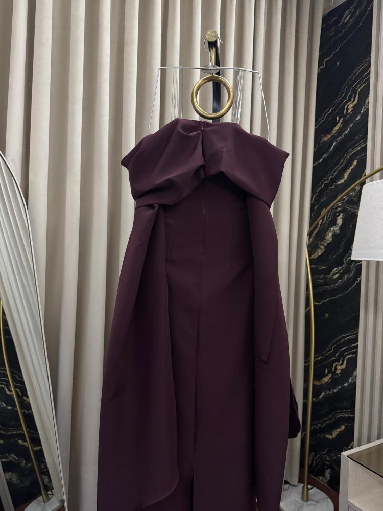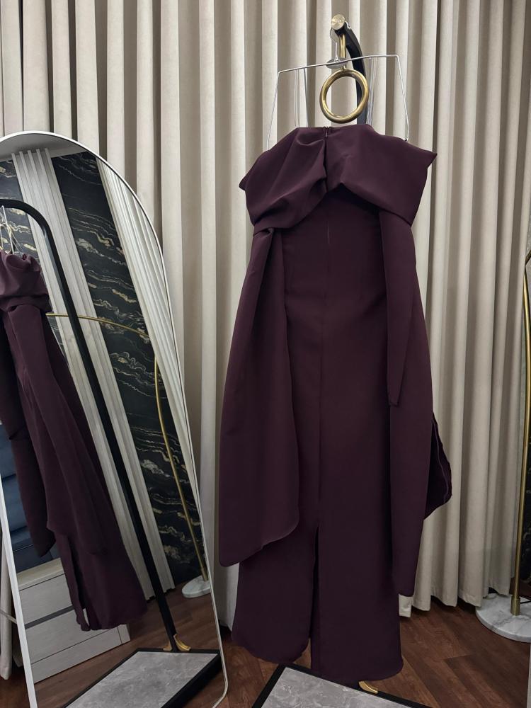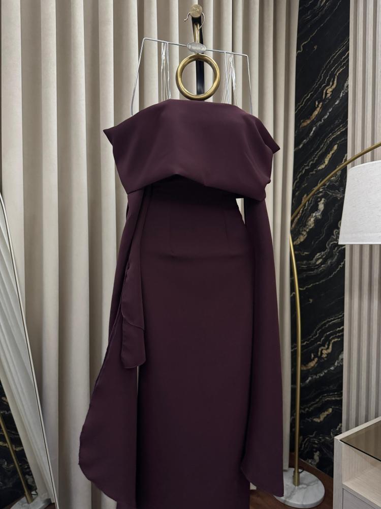 لون الفستان: عودي مطفي (لون دافئ وهادئ يناسب المناسبات المختلفة).