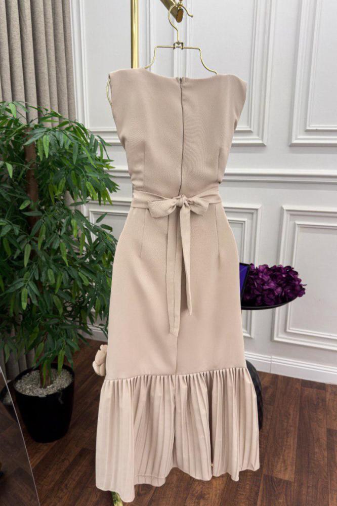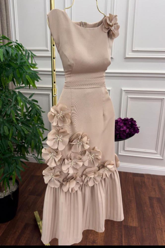 يتميز الفستان بأكمام قصيرة ولا يحتوي على ياقة، مع وردة صغيرة على الكتف الأيسر تضيف لمسة الجزء السفلي من الفستان مزين بورود موزعة بشكل متناثر، ولكل وردة لؤلؤة صغيرة في وسطها.لمسة من الأناقة والبساطة.