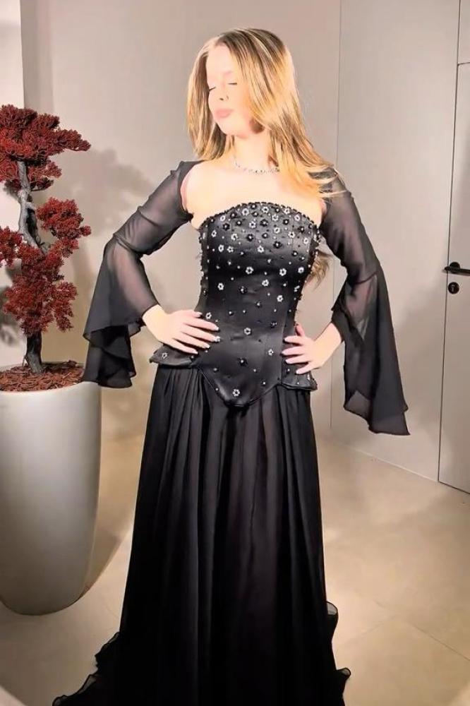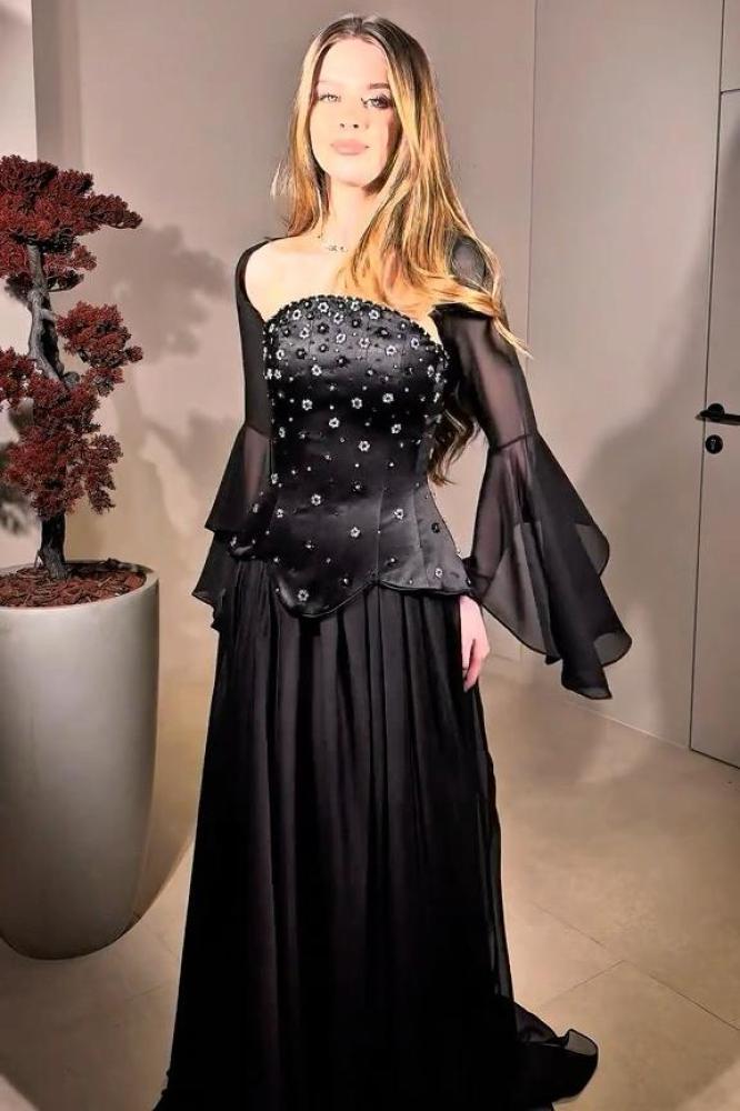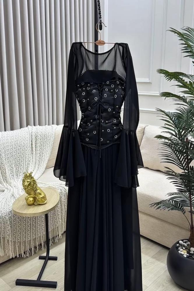 فستان يتميز بتصميم فاخر وأنيق باللون الأسود: مزين بحبات لامعة تشبه الأحجار الكريمة، مما يضفي لمسة من الفخامة.اكمام طويلة وشفافة، تضيف لمسة أنيقة وعصرية.فستان طويلة وواسعة، مصنوعة من قماش خفيف يتدلى بانسيابية، مما يمنح الفستان مظهراً كلاسيكياً.