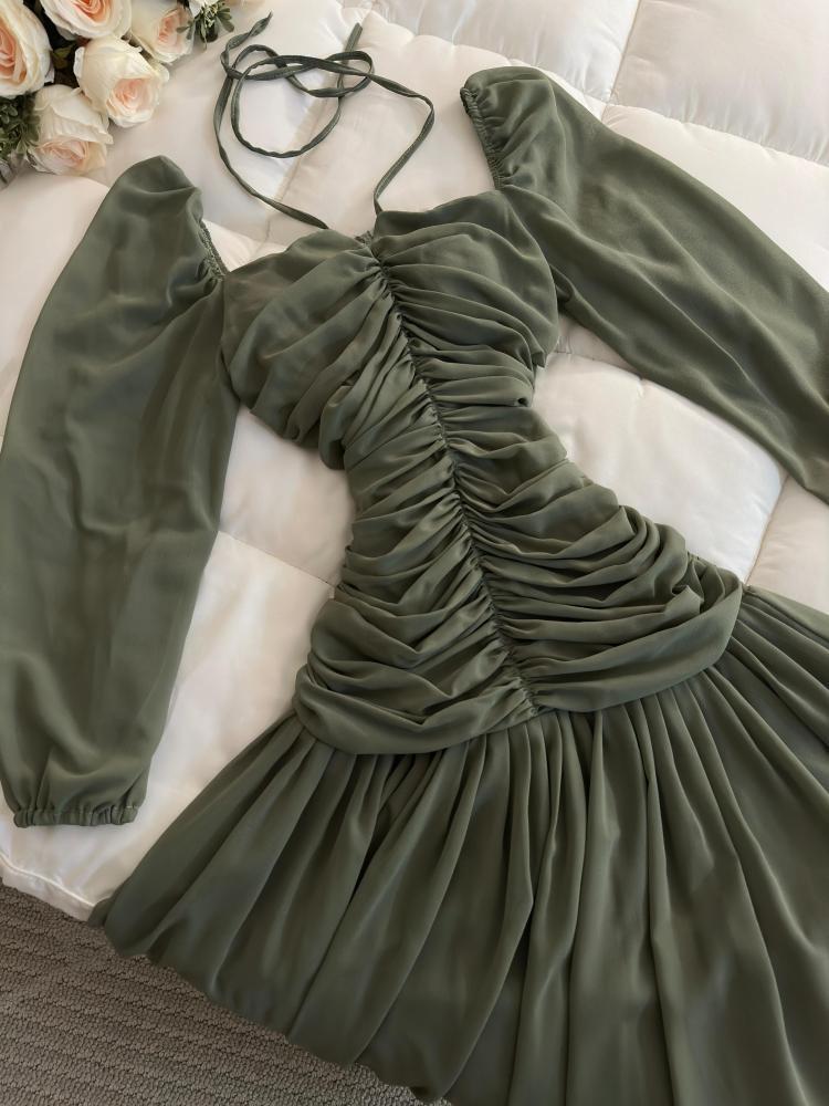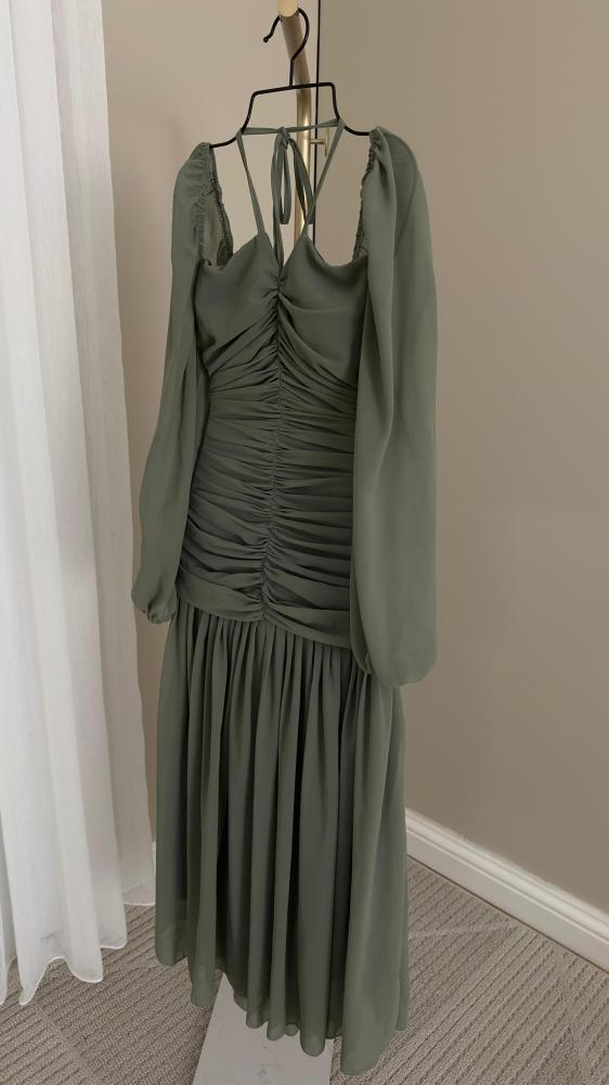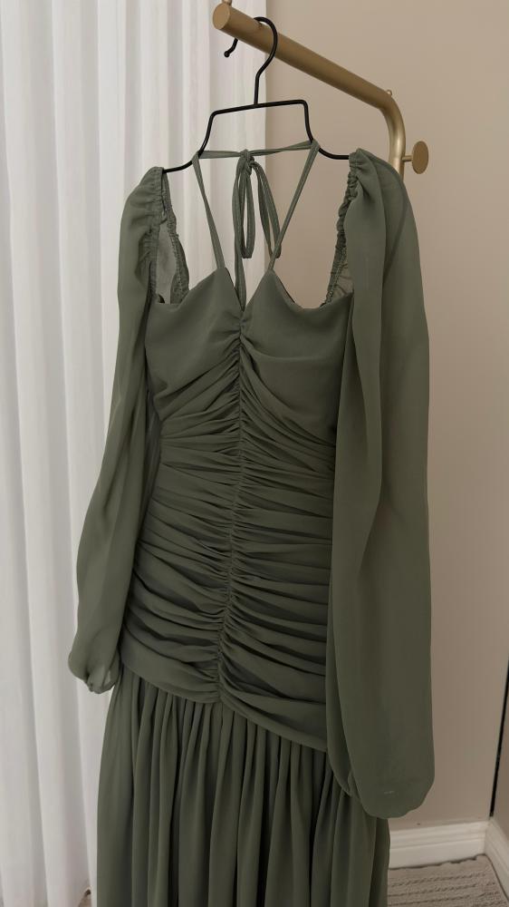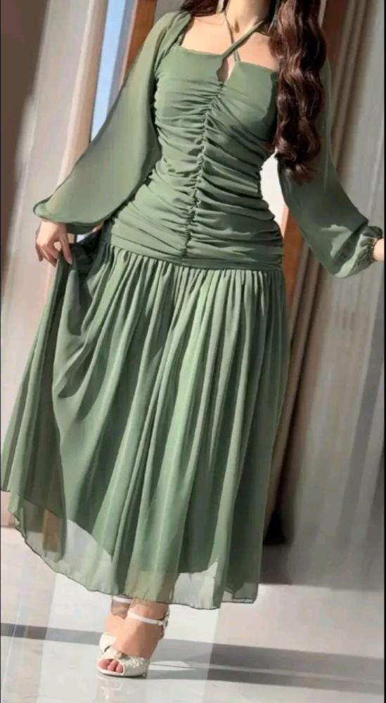 فستان زيتي بكسرات أنيقة