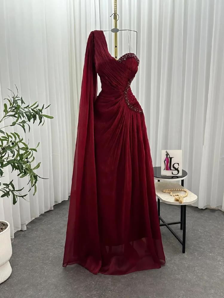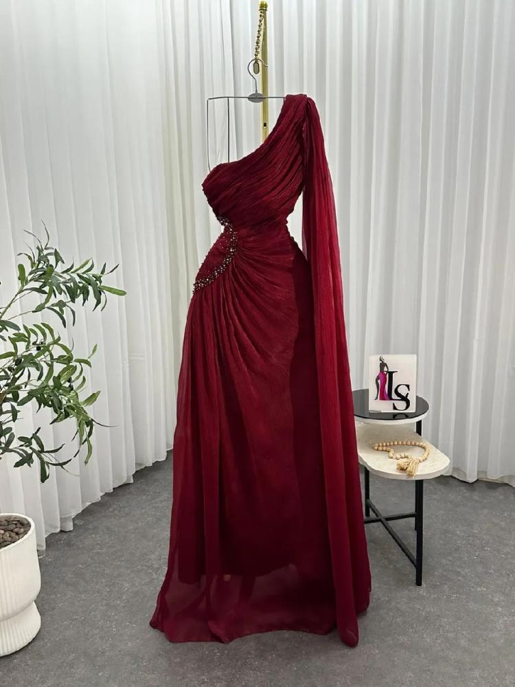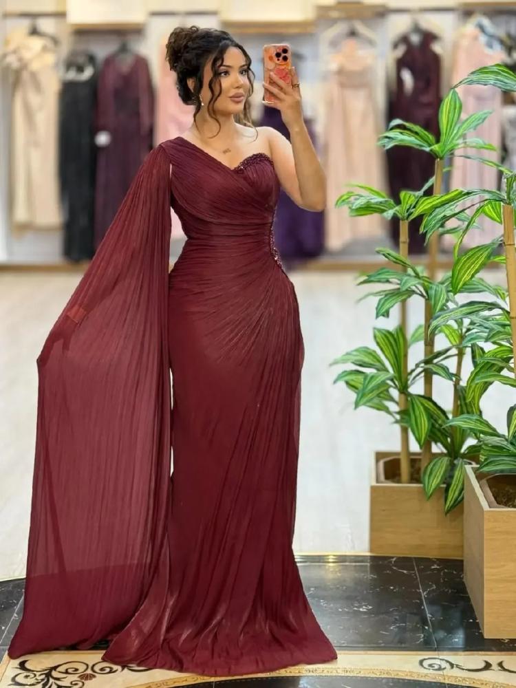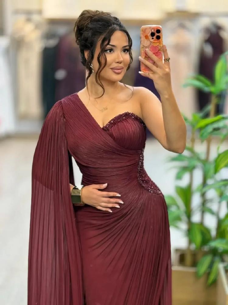 . يتميز بتصميمه الفريد بكتف واحد، حيث ينسدل قماش الشيفون بطريقة انسيابية ليمنحك إطلالة ملكية. يجمع الفستان بين القماش الشفاف والبطانة الداخلية من الدانتيل الأنيق باللون البيج، مما يضفي عليه طبقة من الفخامة والعمق.