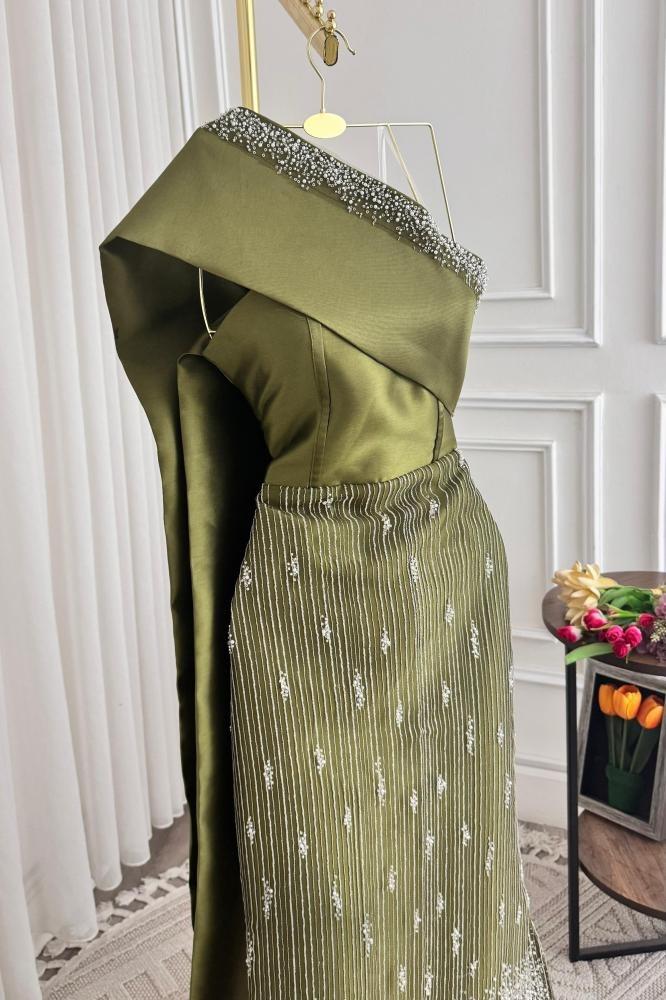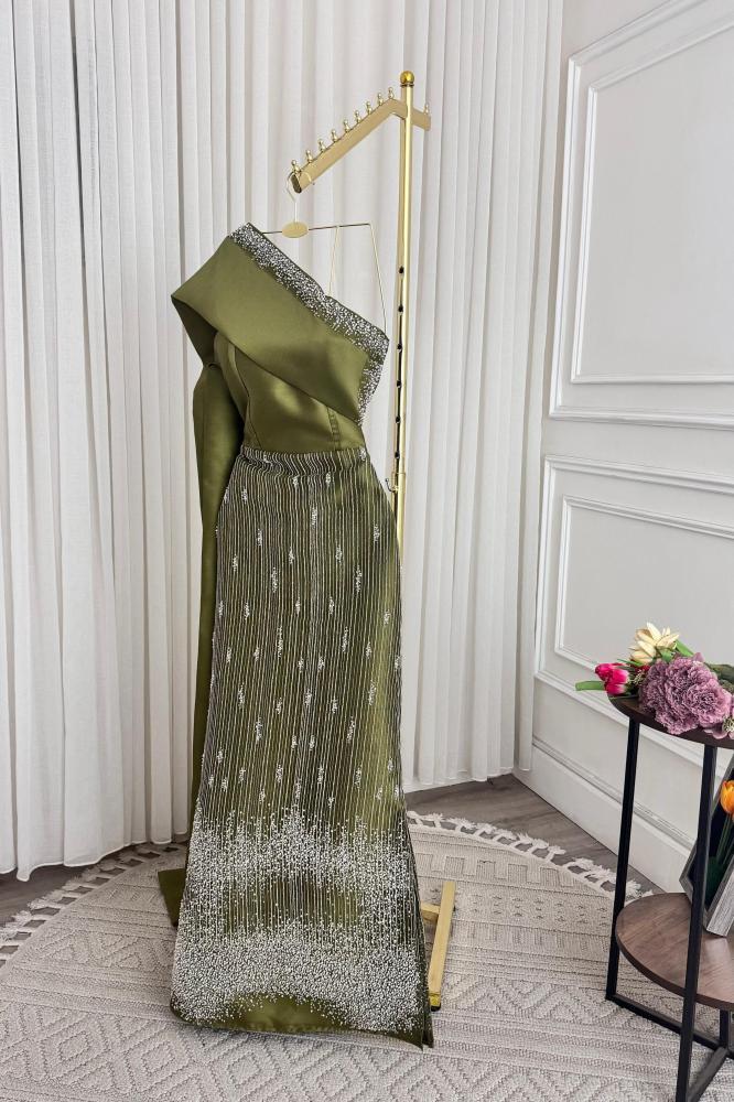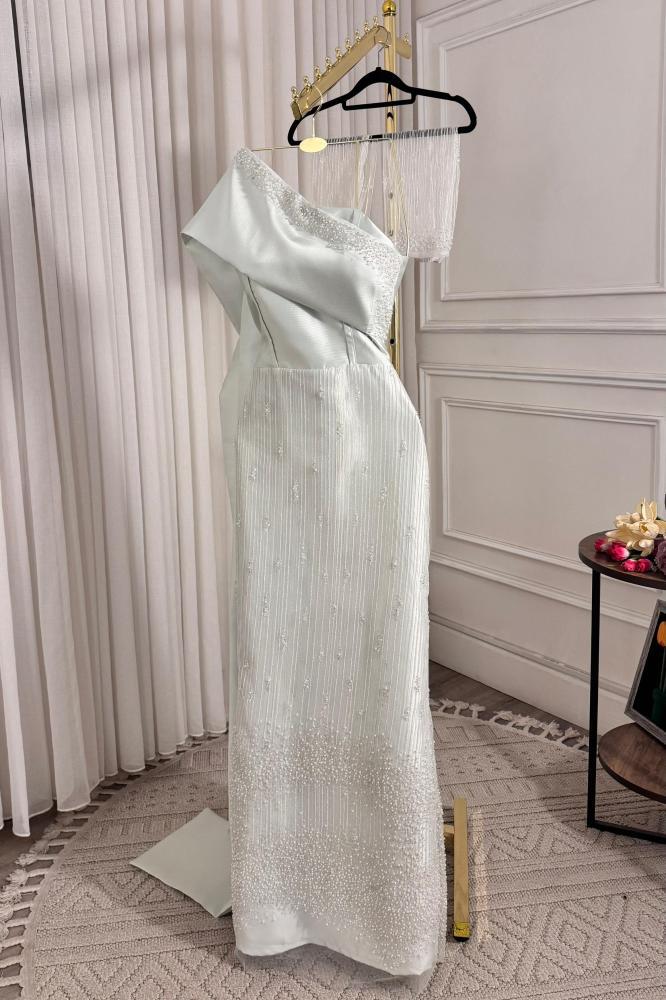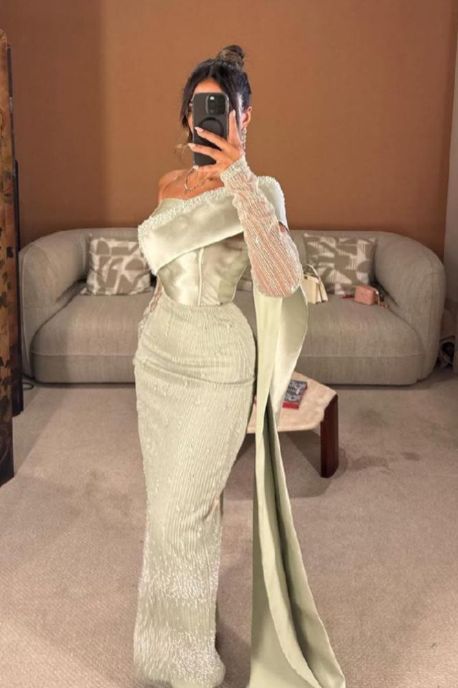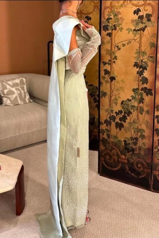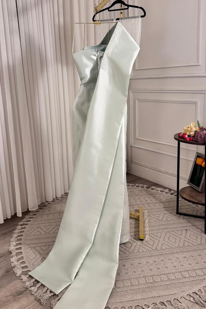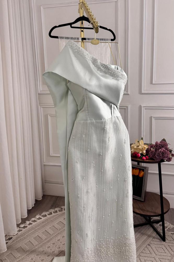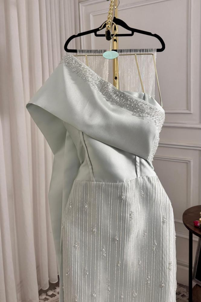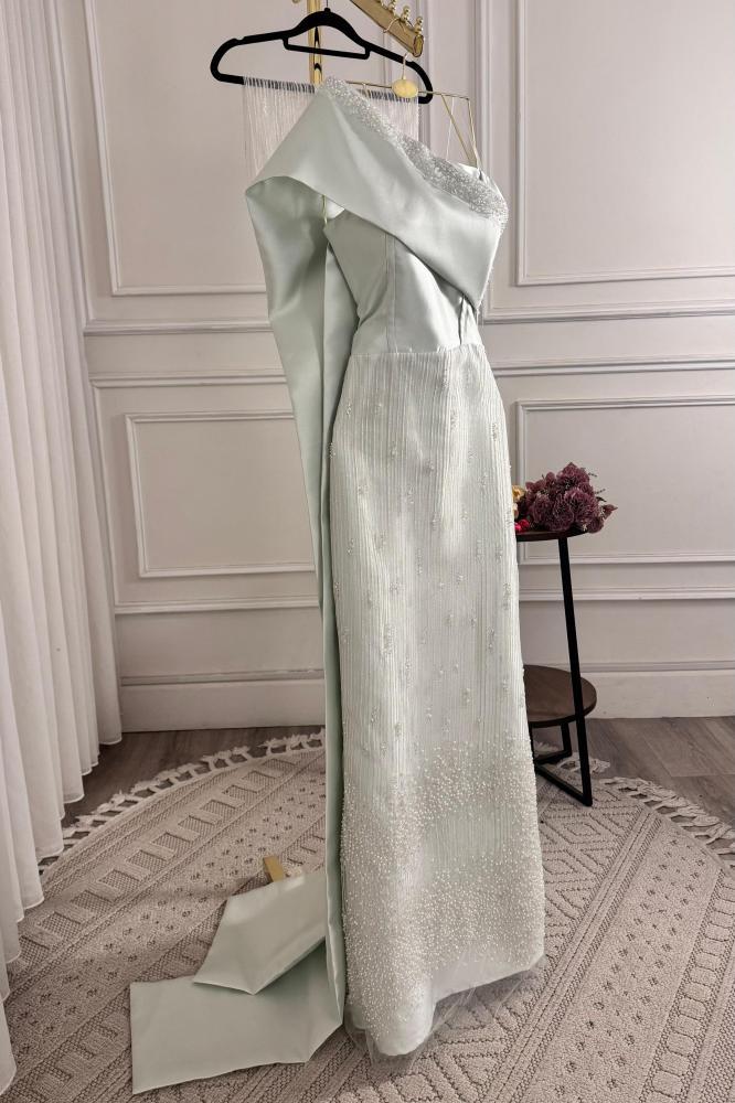 فستان بلون أخضر فاتح هادئ، يضفي إحساسًا بالنقاء والرقي مزين بتطريزات دقيقة ولامعة الأكتاف مكشوفة الأكمام شفافة ومطرزة،