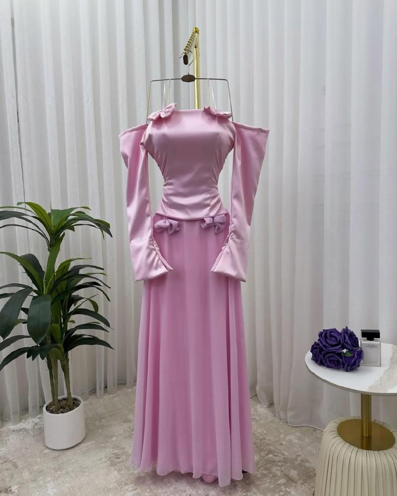 * التفاصيل الإضافية: الفيونكات على الأكتاف والخصر تعتبر تفاصيل تصميمية فريدة تميز الفستان وتجعله لافتًا للنظر.