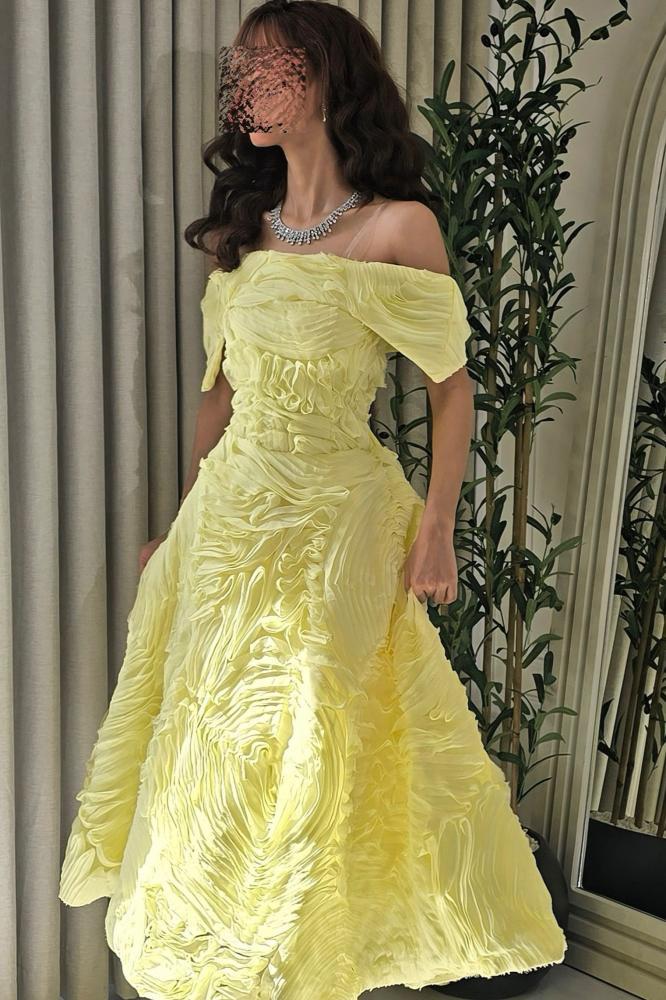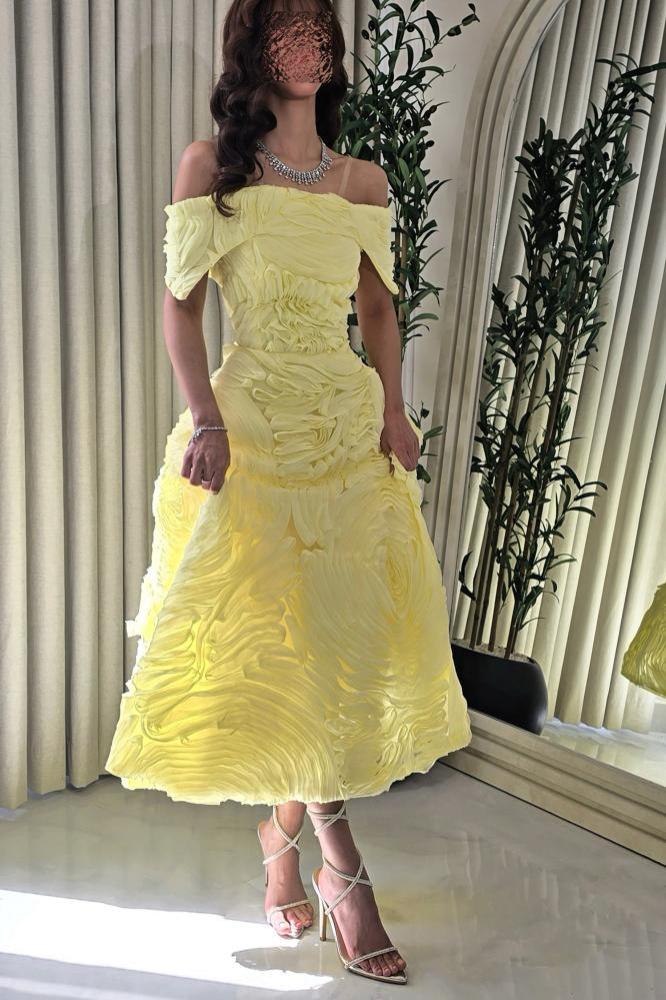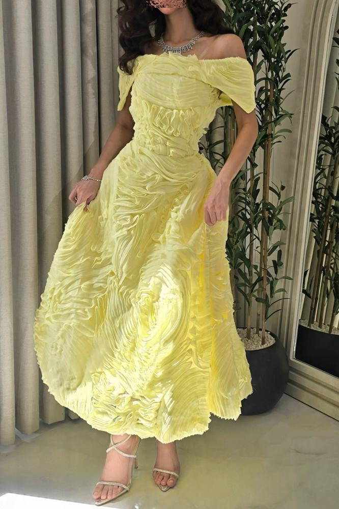 ،فستان انيق ومبهج بلون الأصفر الليموني يتميز بتصميم مبتكر وملمس💛
