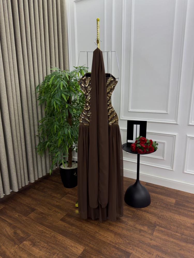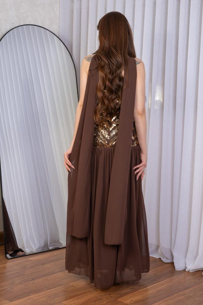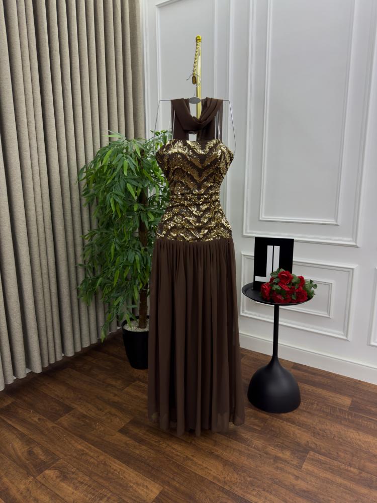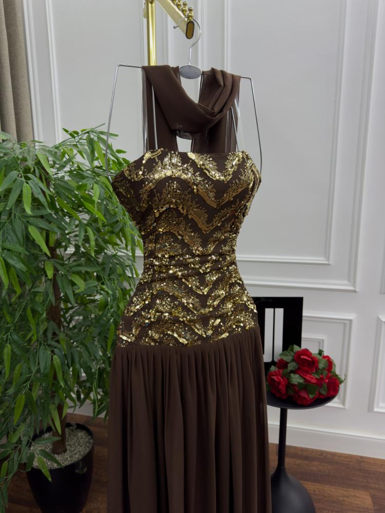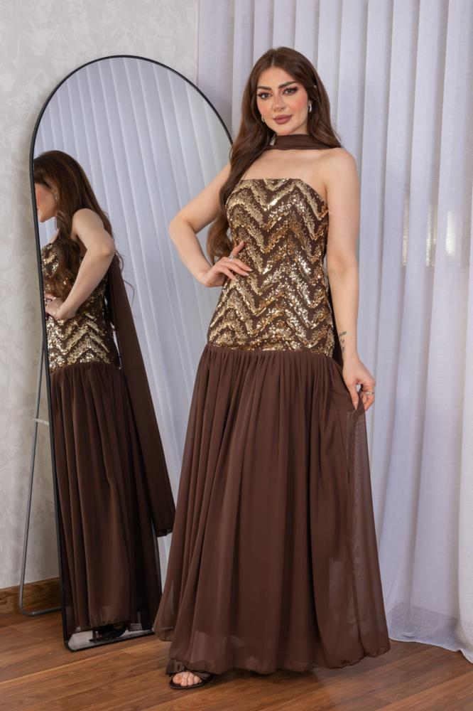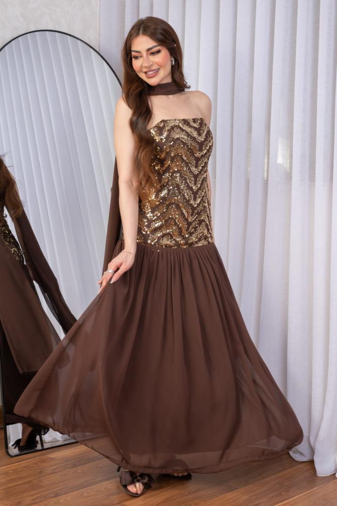يتميز بتصميم علوي مميز مرصع بالترتر الذهبي اللامع بنقشة متعرجة (شيفرون). الفستان ذو ياقة رسن (Halter-neck) متصلة بوشاح من القماش، وينسدل بتنورة طويلة انسيابية من الشيفون البني. مثالي للمناسبات الفاخرة والسهرات، يجمع بين الفخامة والبساطة.
