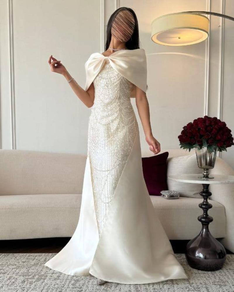 نوع التصميم/ فستان سهره اوف وايت يتميز بكلفه خرز مع صدريه فيونكه وذيل طويل من الخلف