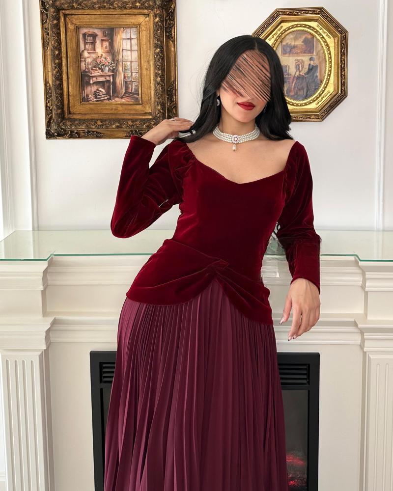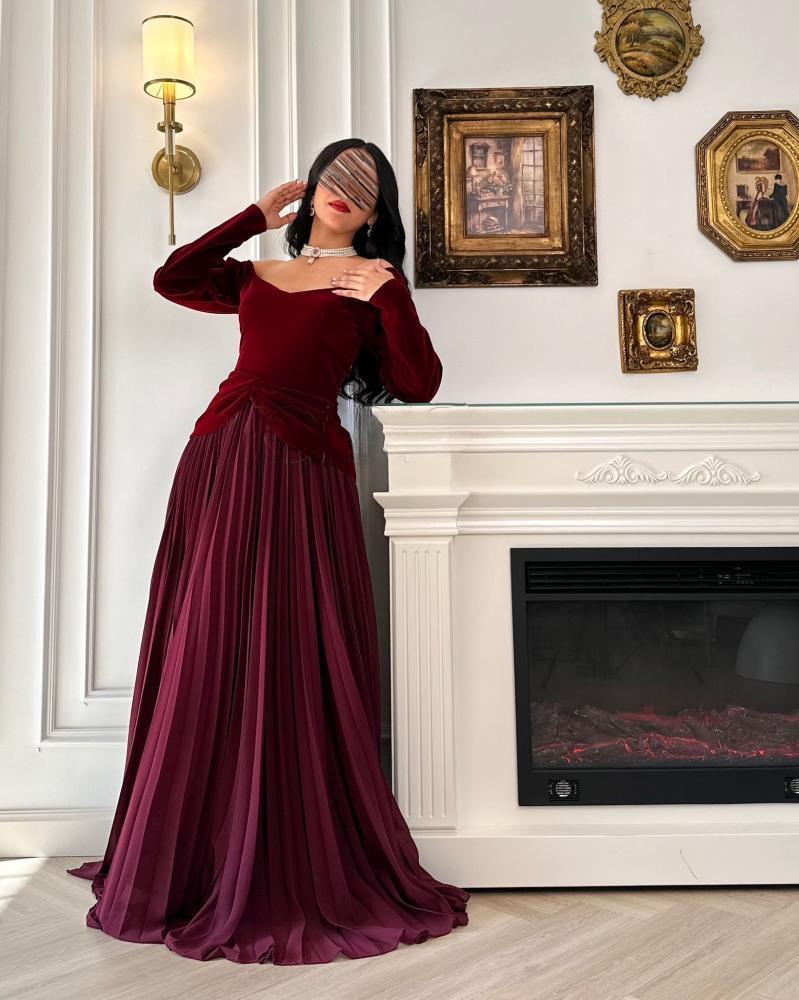 الفستان يتميز بتصميمه الراقي والجذاب بلون العنابي الداكن، وهو مقسم إلى قسمين. القسم العلوي مصنوع من المخمل الفخم بأكمام طويلة وتصميم مكشوف الكتفين مع قصة ناعمة وضيقة تضفي لمسة أنثوية أنيقة. يتميز الخصر بتفاصيل ملتفة أنيقة تزيد من جمال التصميم.