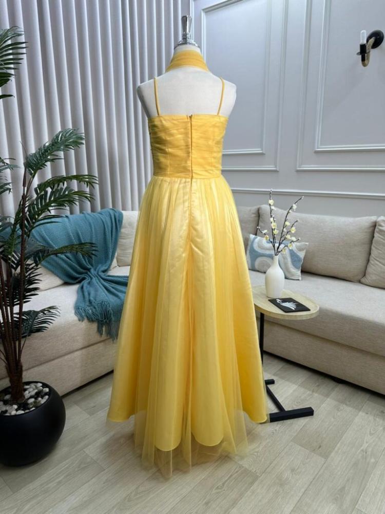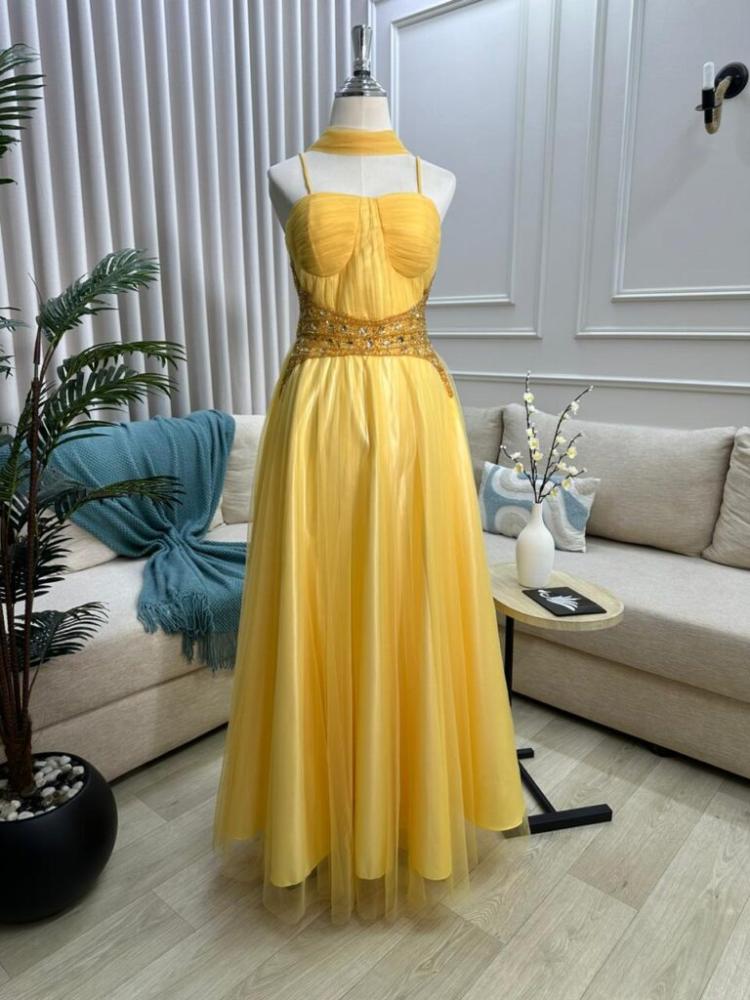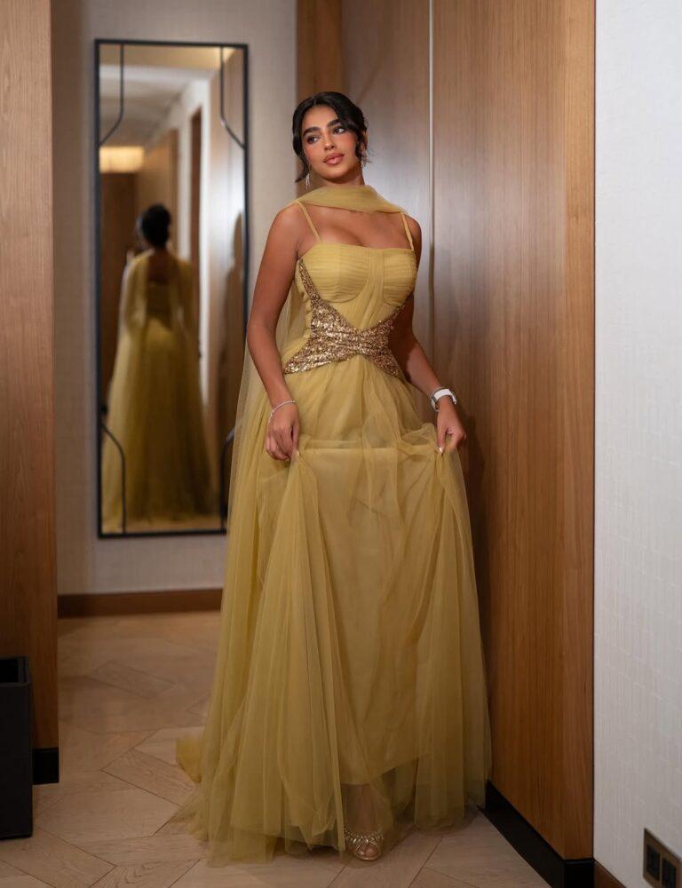 يتميز بصديرية بحمالات رفيعة وحزام خصر عريض مطرز بالذهبي اللامع. يأتي مع وشاح/شال رفيع قابل للإضافة.