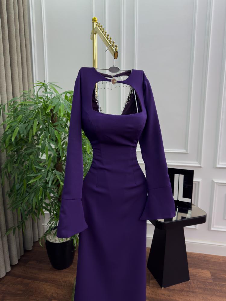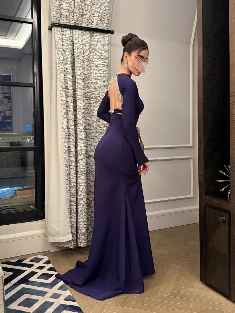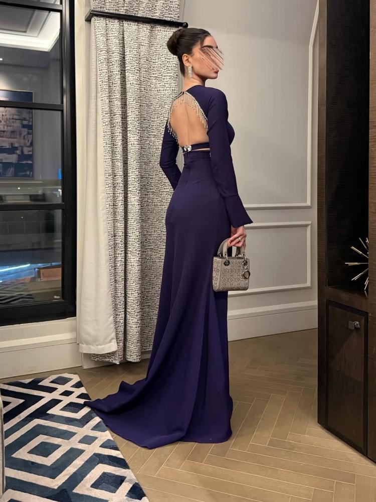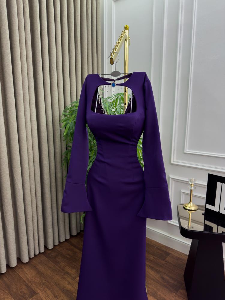 فستان سهرة بنفسجي داكن طويل ومُحدد للقوام