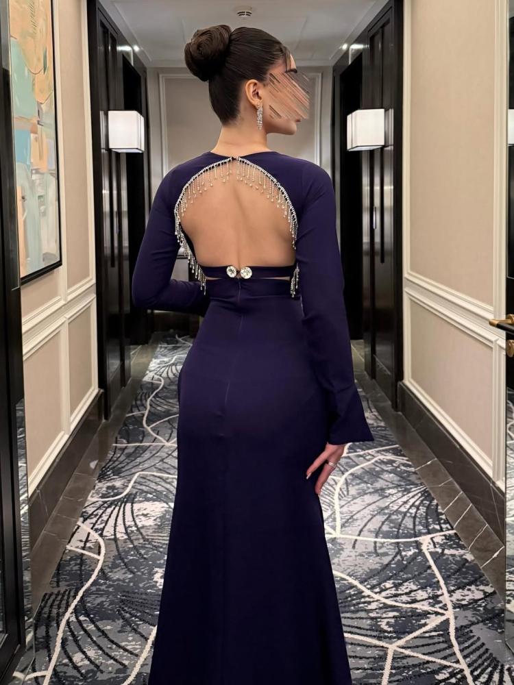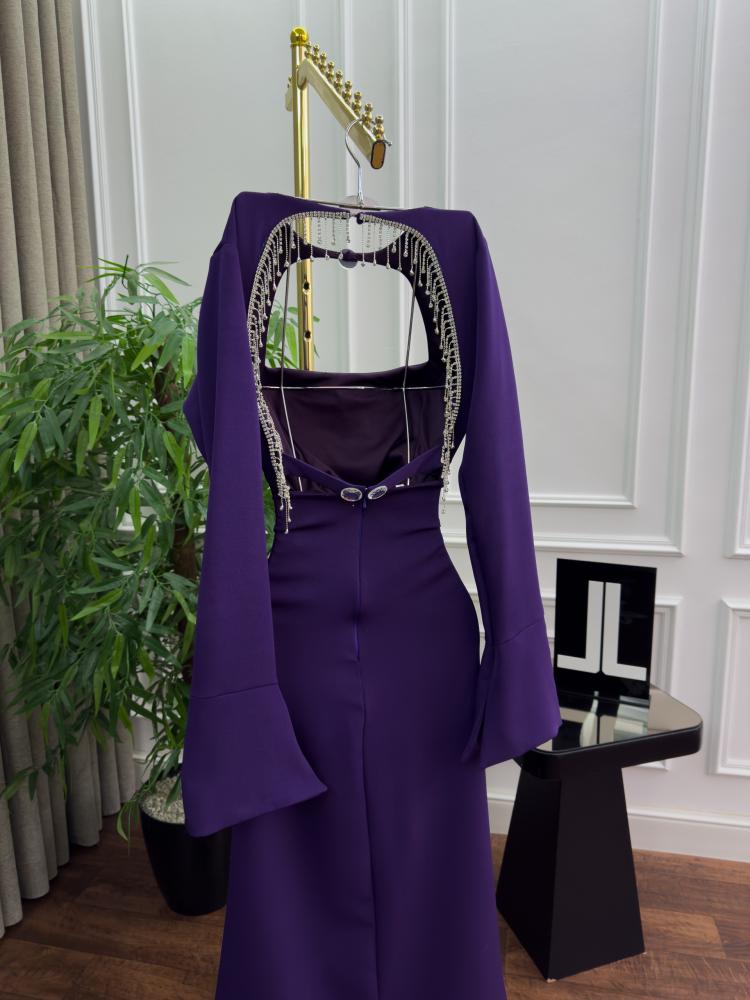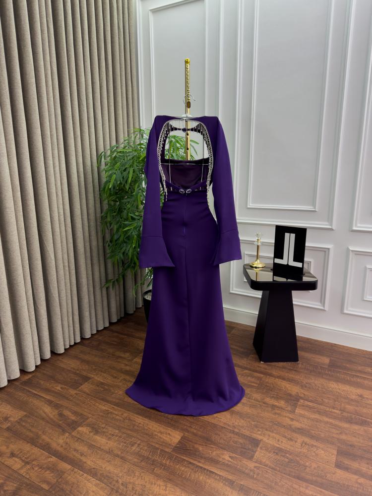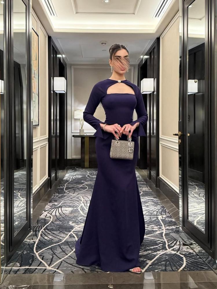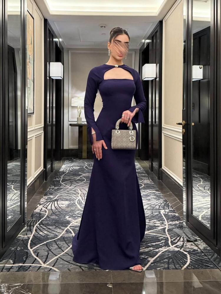 فستان سهرة بنفسجي داكن طويل ومُحدد للقوام