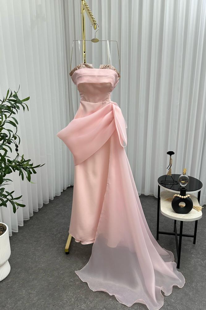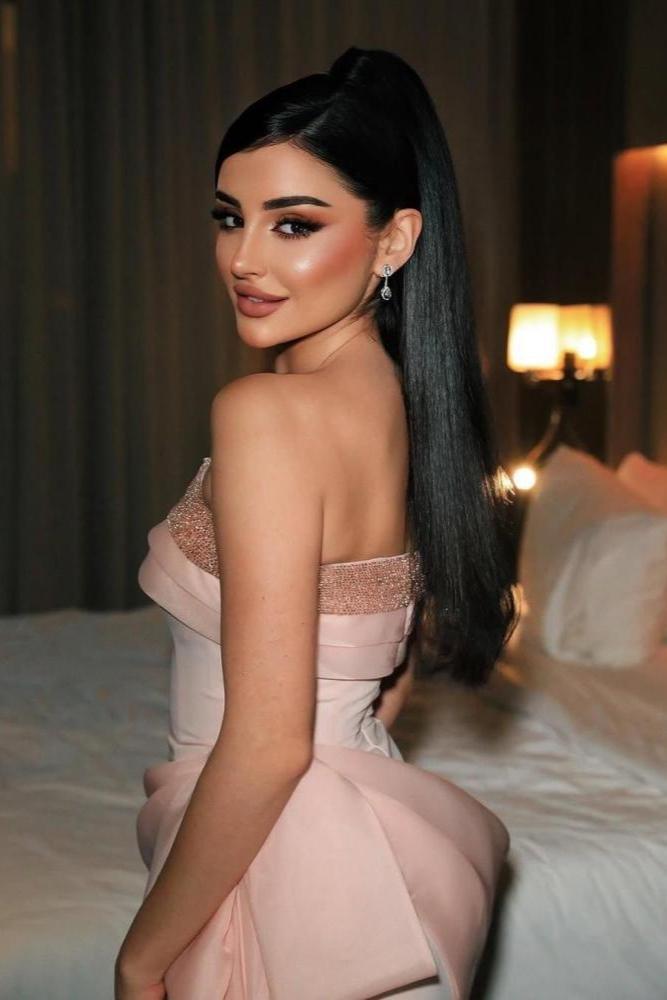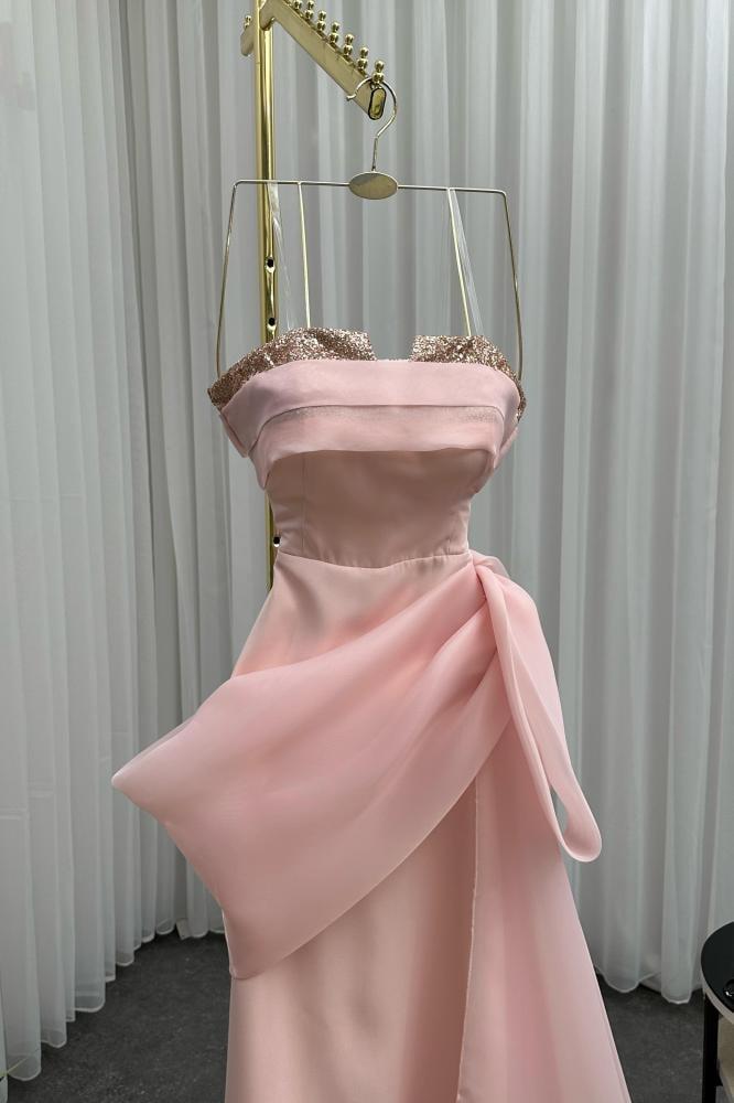 فستان الوردي الفاتح يجمع بين الأنوثة والرقي فستان طويل بدون أكتاف، يتميز بقصة ضيقة من الأعلى .تطريزات لامعة على الصدر تضيف بريقًا فخمًا، مع عقدة جانبية أنيقة تمنح الفستان لمسة فنية جذابة.