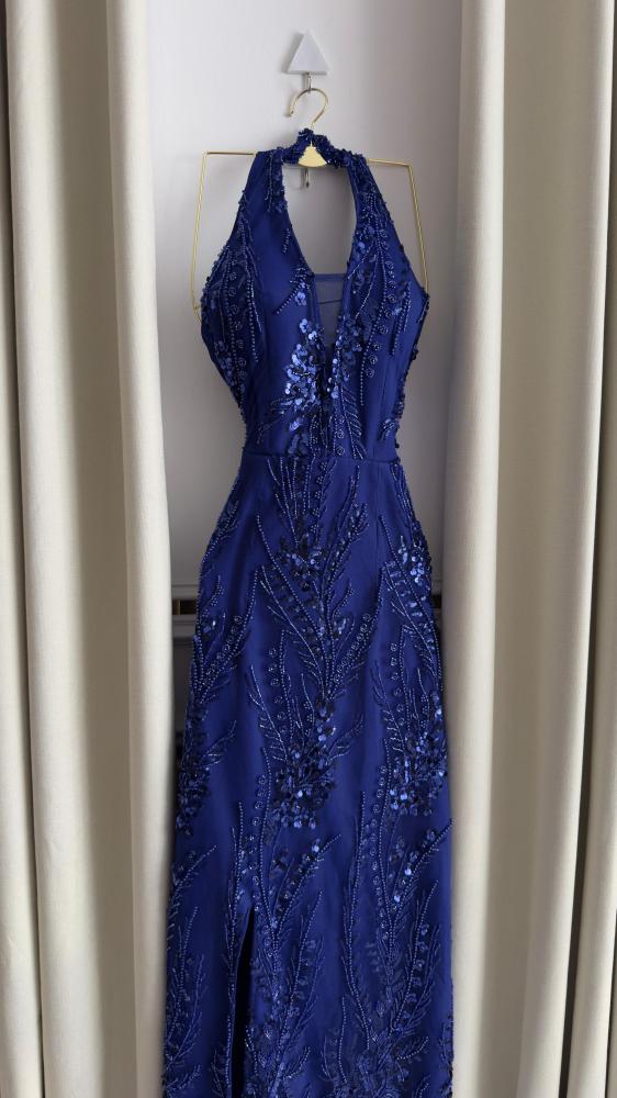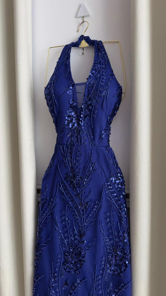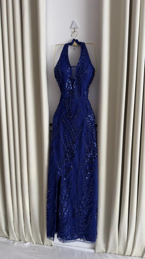 يتميز بتصميم أنيق بياقة هالتر (Halter) وفتحة صدر على شكل حرف V. يزين الفستان بالكامل بتطريزات لامعة من الخرز والفصوص المتناثرة على شكل أغصان نباتية، مما يمنحه إطلالة متألقة. كما يأتي بشق جانبي يكشف عن الساق لإضافة لمسة من الجاذبية، وهو مثالي للحفلات والسهرات