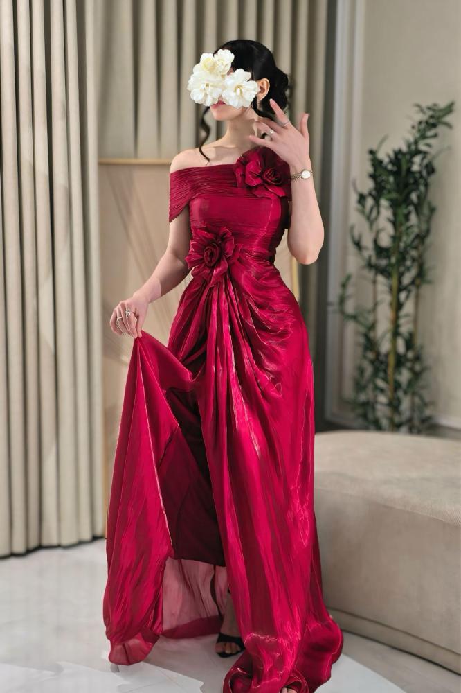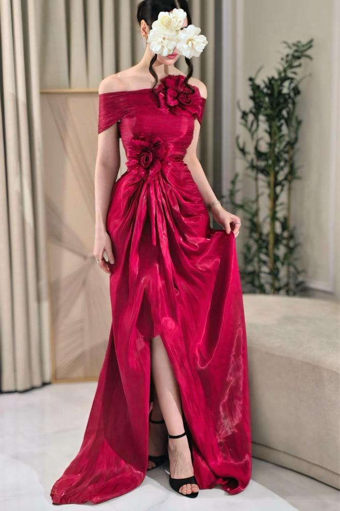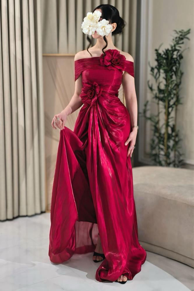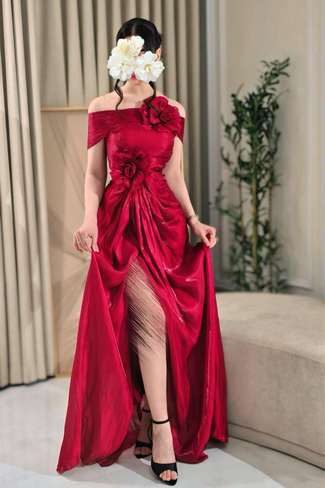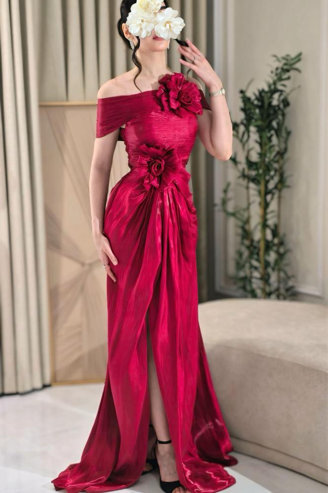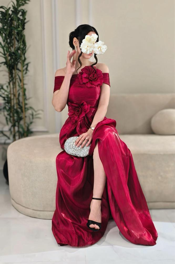 فستان باللون الأحمر القوي مزين بورود كبيرة من القماش، واحدة على الكتف والأخرى عند الخصر قصّة الفستان أوف شولدر تكشف الكتفين التنورة مصممة بأسلوب Draped مع فتحة عالية