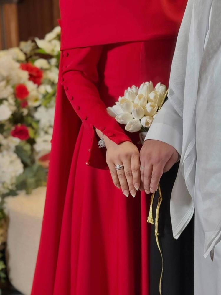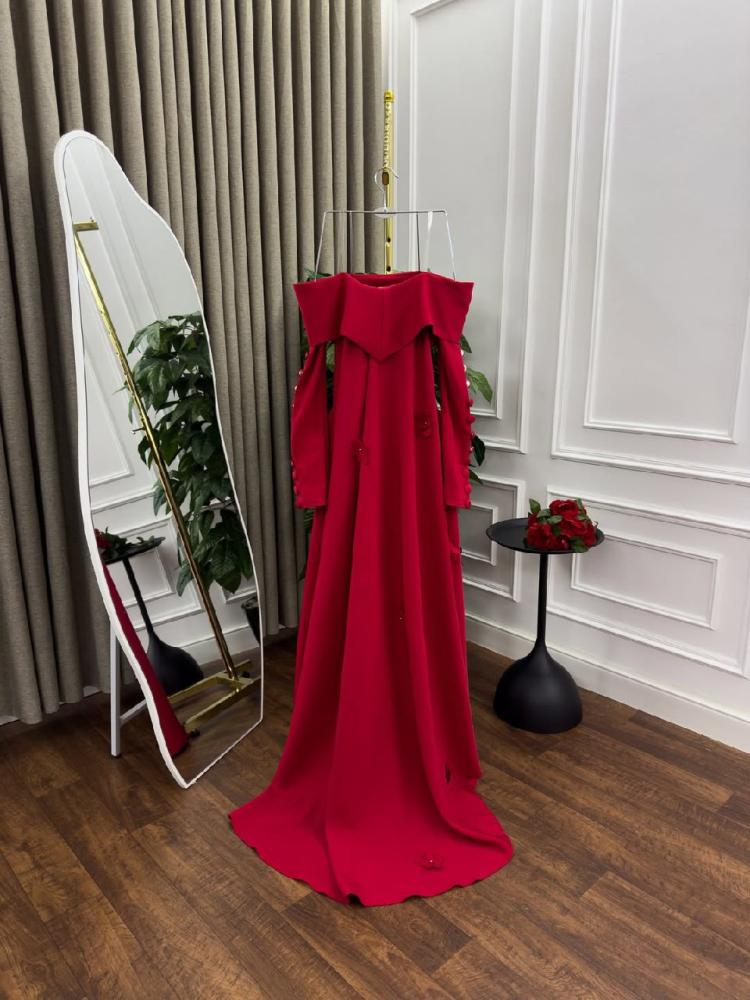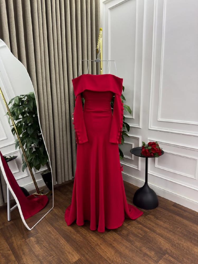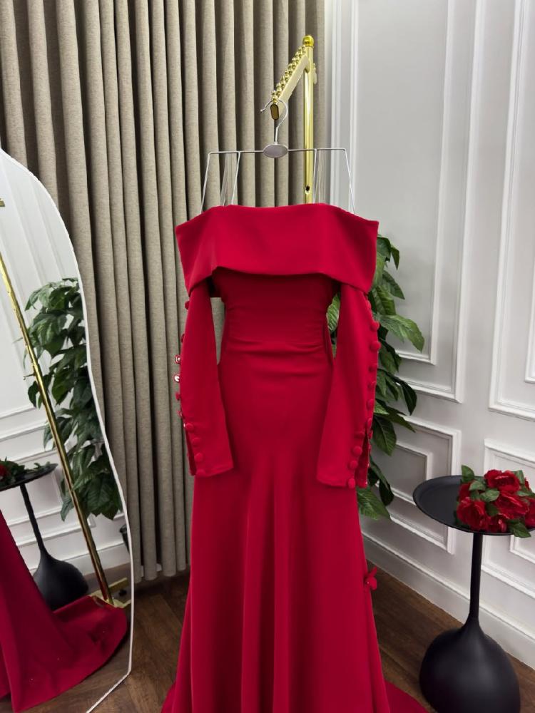يتميز بكتف مكشوف (Off-shoulder) وأكمام طويلة مزينة بأزرار على الأطراف. يتميز بقصة مخصرة تبرز جمال القوام وتنورة واسعة قليلاً تنسدل بأناقة. مثالي للمناسبات الخاصة والسهرات