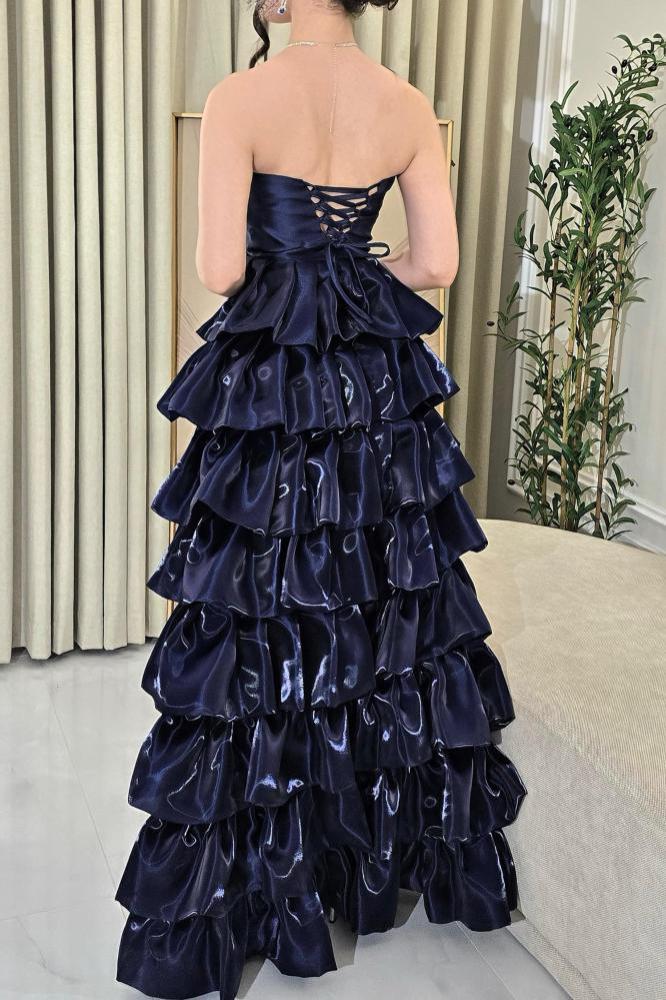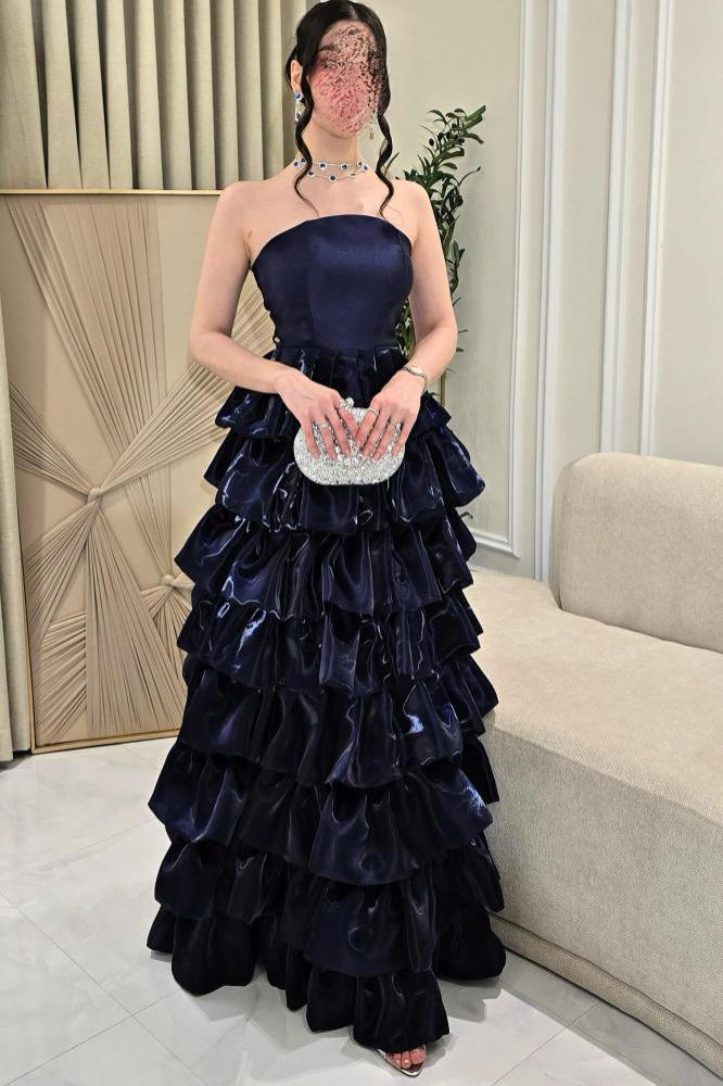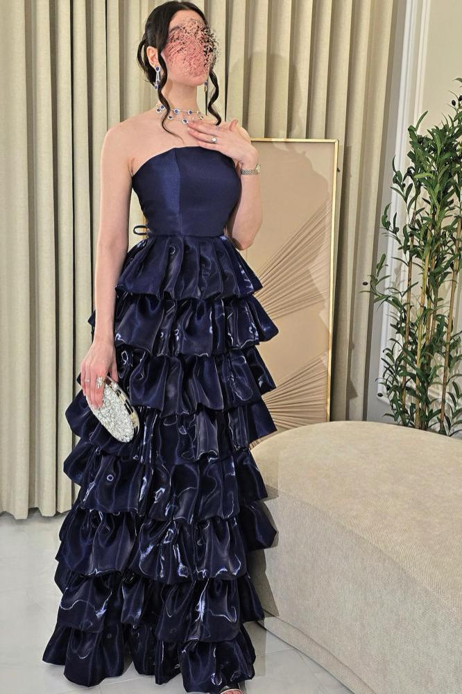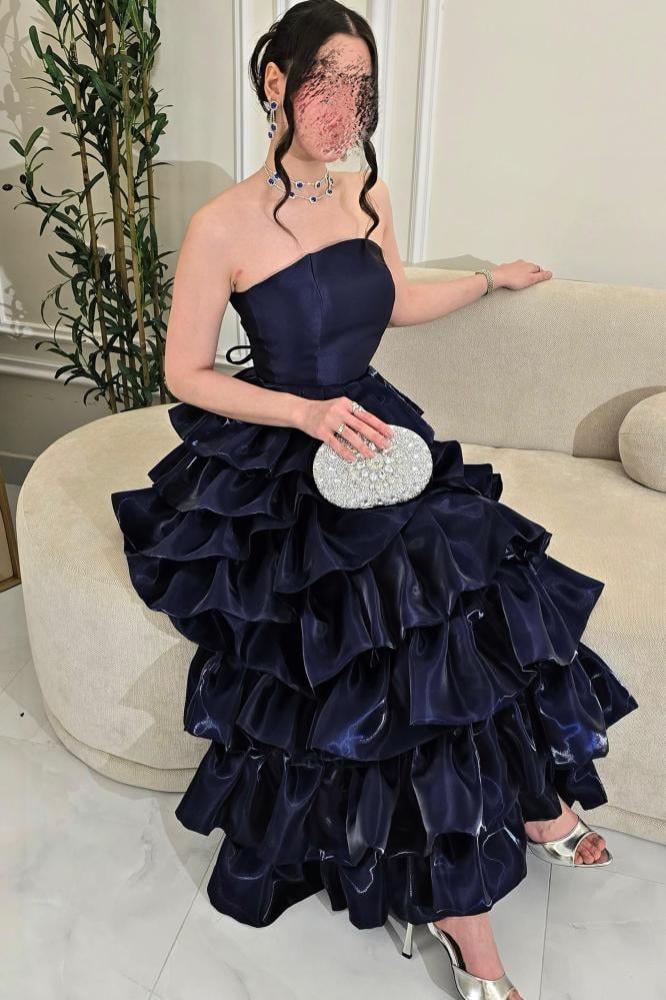 فستان يصرخ أناقة وفخامة بكل تفاصيله 💙بلونه الأزرق الداكن،فستان بدون أكتاف وينساب بطبقات متعددة من الكشكش حتى الأرض