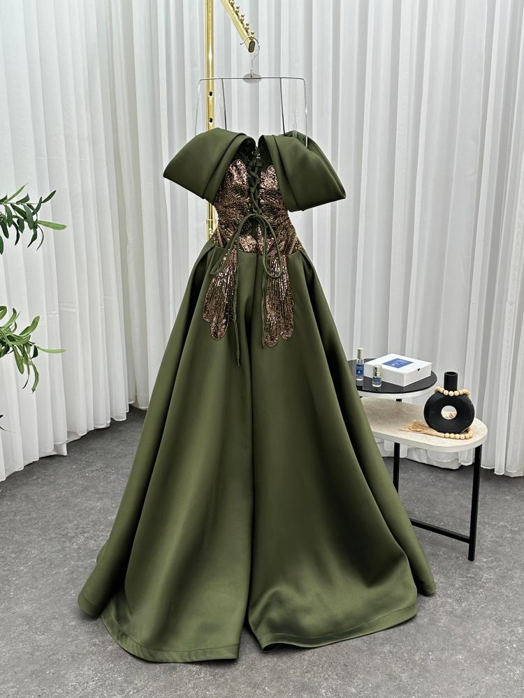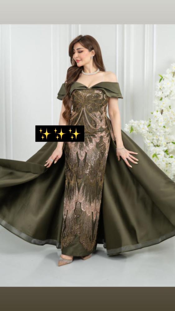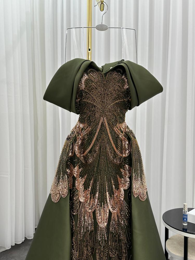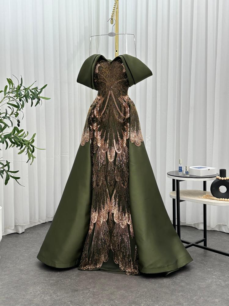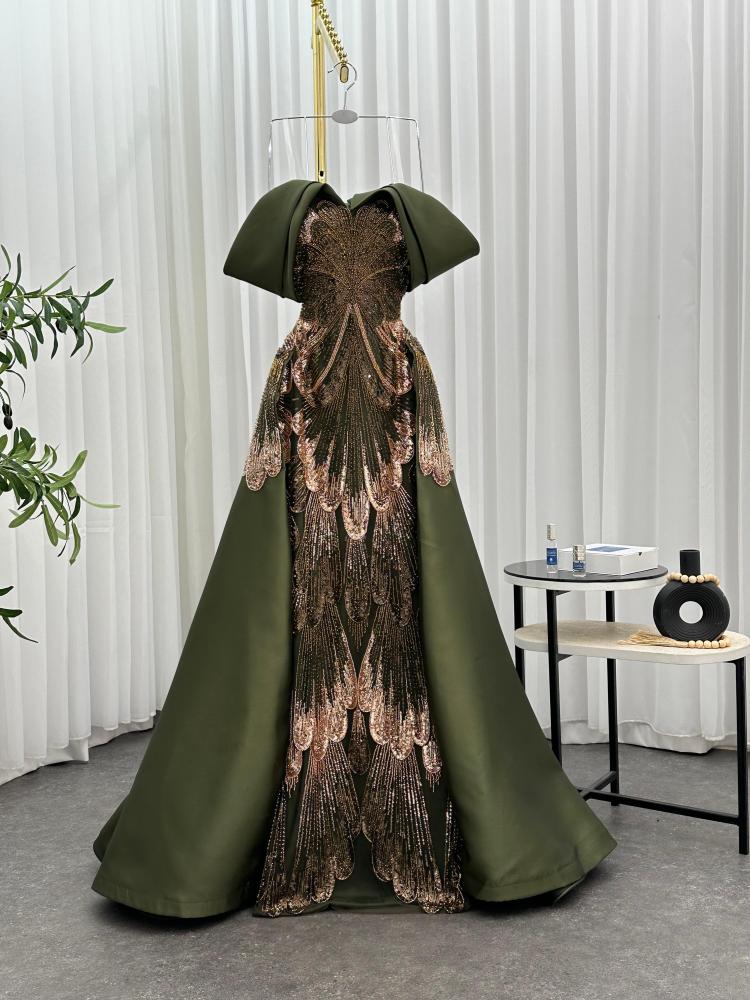 . يتميز الجزء العلوي بتطريزات معقدة ولامعة على شكل ريشة أو أنماط فنية تُبرز الصدر وتنسدل على التنورة. الأكمام الدرامية المنتفخة تضفي لمسة ملكية فريدة، فيما يكتمل الفستان بتنورة من الساتان الفاخر بلون متناسق، تمنحه حجمًا وأناقة. مثالي للسهرات الراقية والمناسبات الكبرى