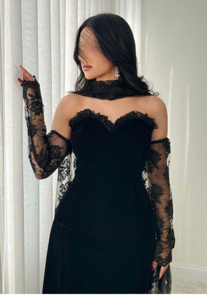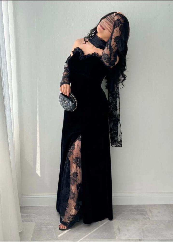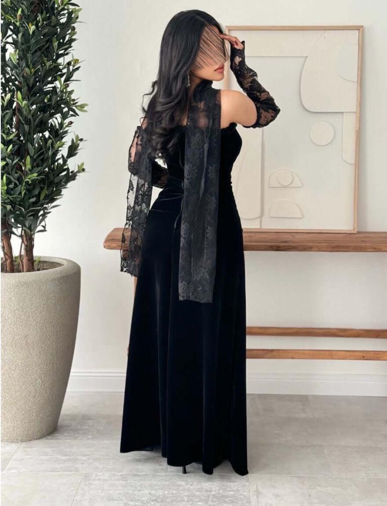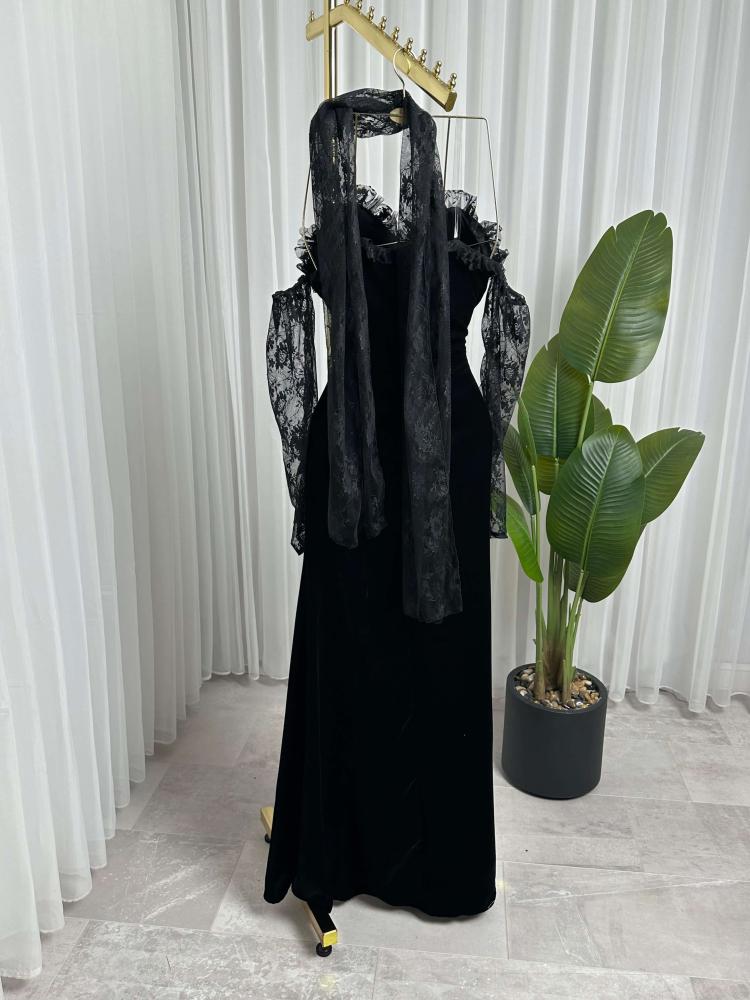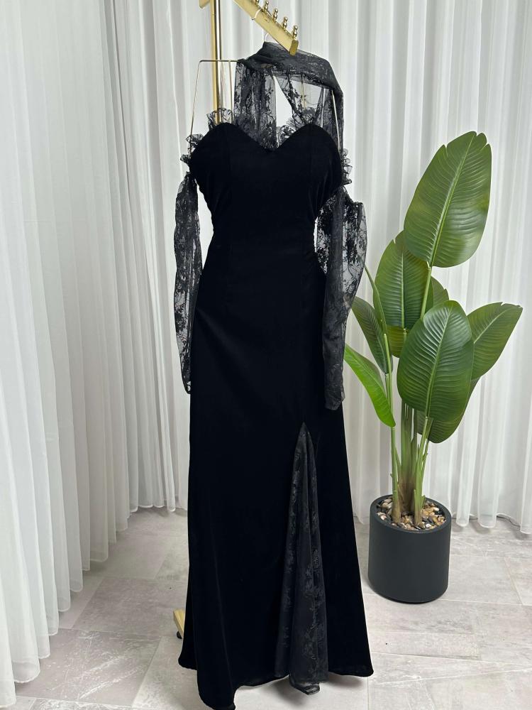 فستان سهرة اسود طويل باكمام منفصله وشال خارجي
