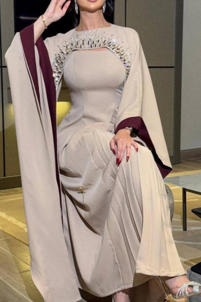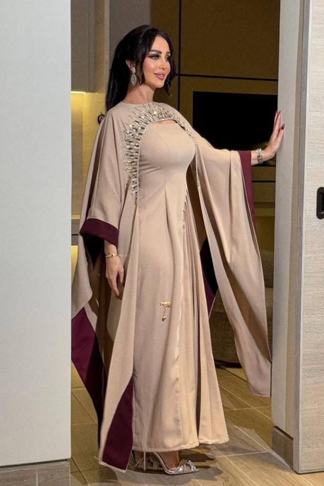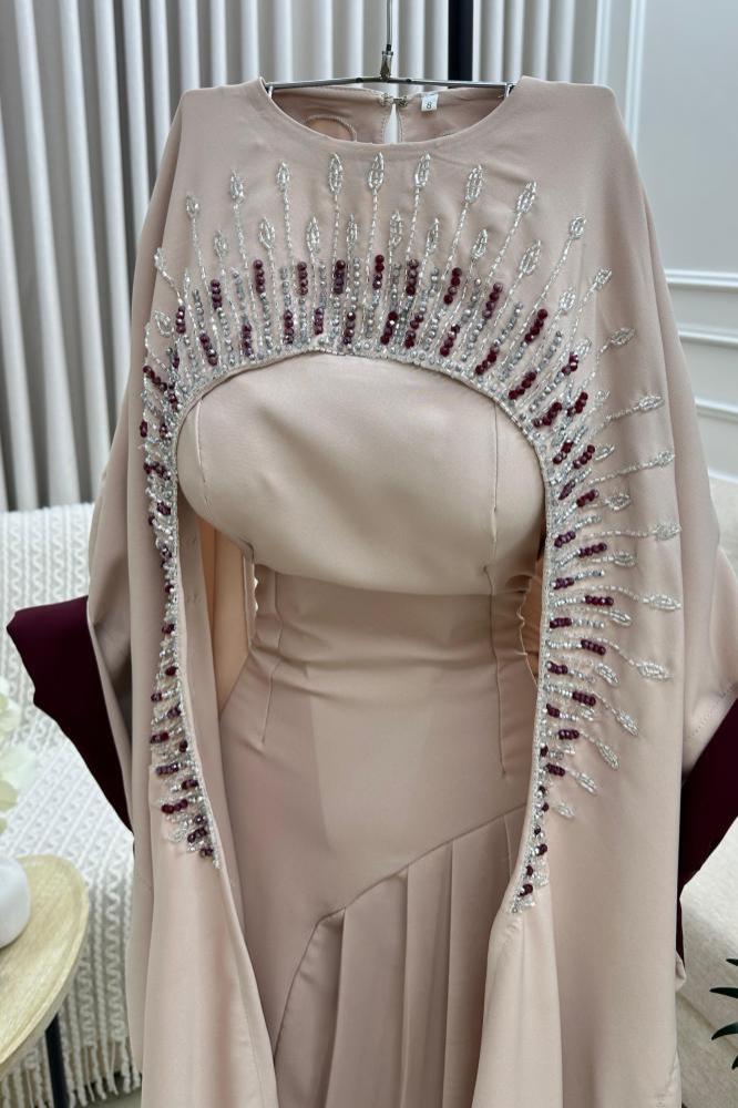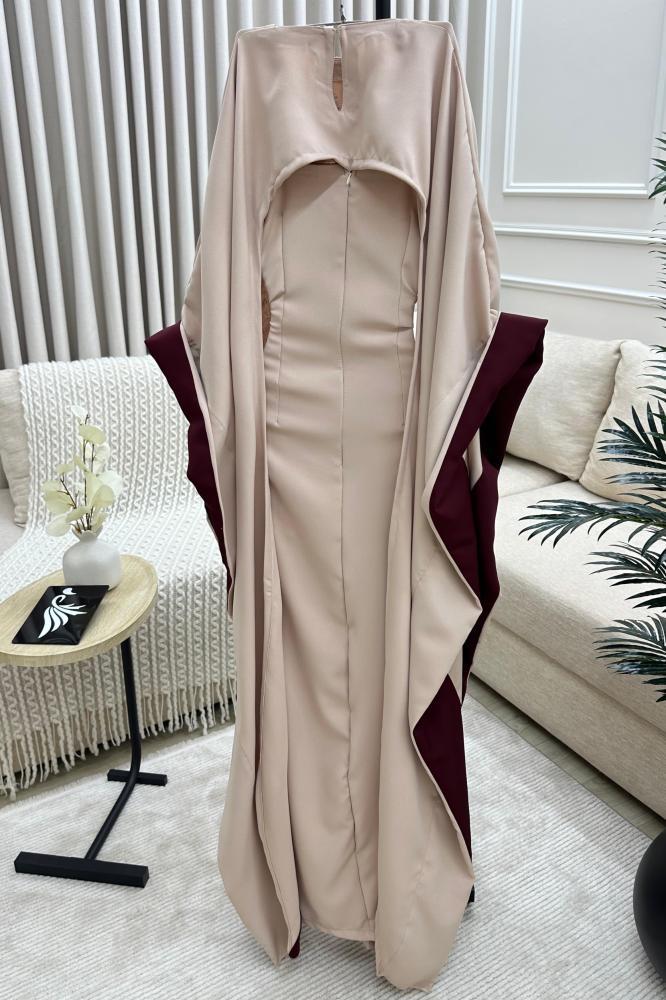 فستان يتميز بتصميم عصري وألوان محايدة. له أكمام طويلة تتميز بخطوط برغنديه على الحواف، مما يضفي لمسة من الأناقة المعاصرة ، يوجد على الكتفين تفاصيل جمالية باللون الأبيض و البرغندي، بلورات توحي بفخامة وإبداع في التصميم.