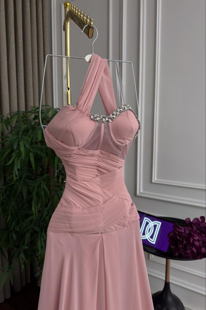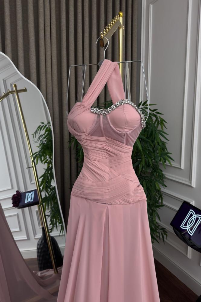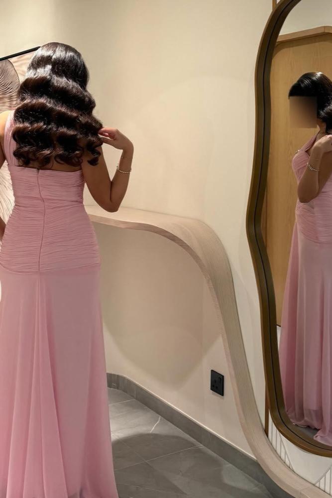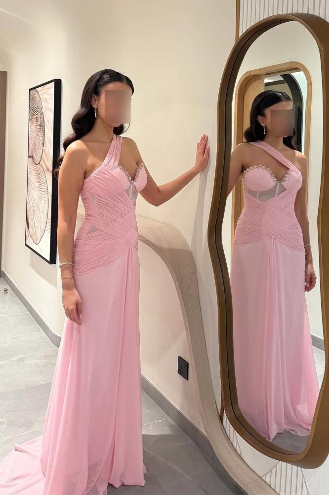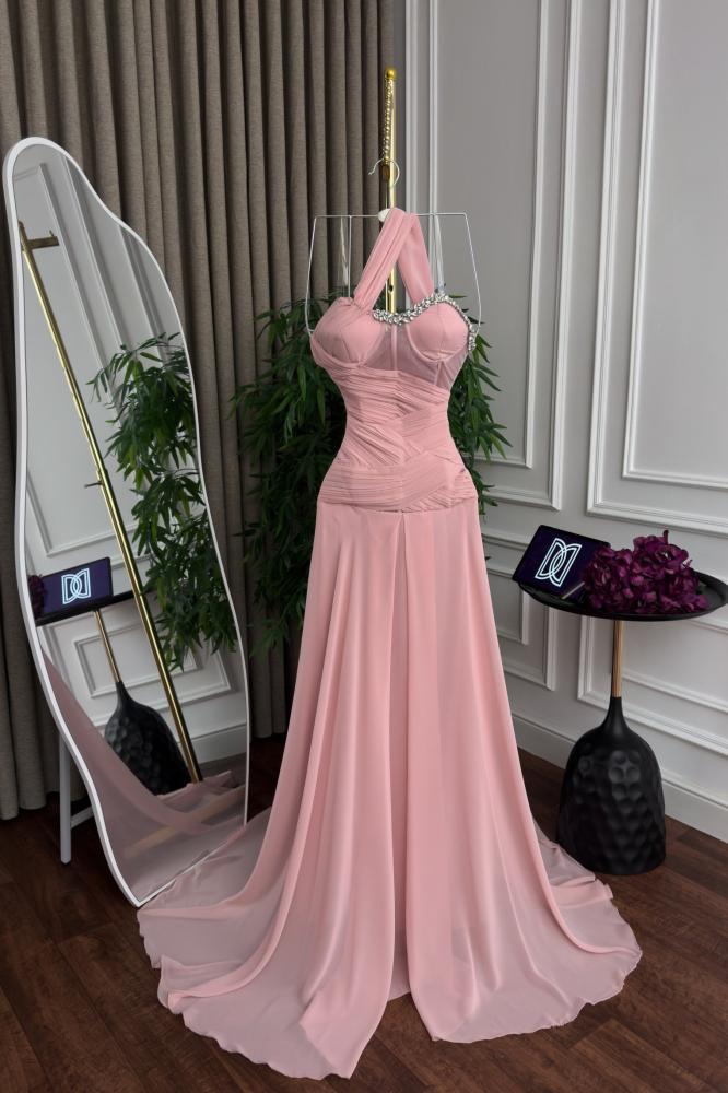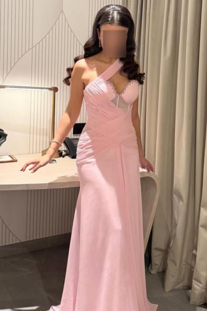 فستان يتميز بإطلالة فاخرة لون وردي فاتح الكتف الواحد ويبرز جمال الكتف والرقبة.القصة ضيقة وطويلة، تبرز القوام بأسلوب أنثوي أنيق.