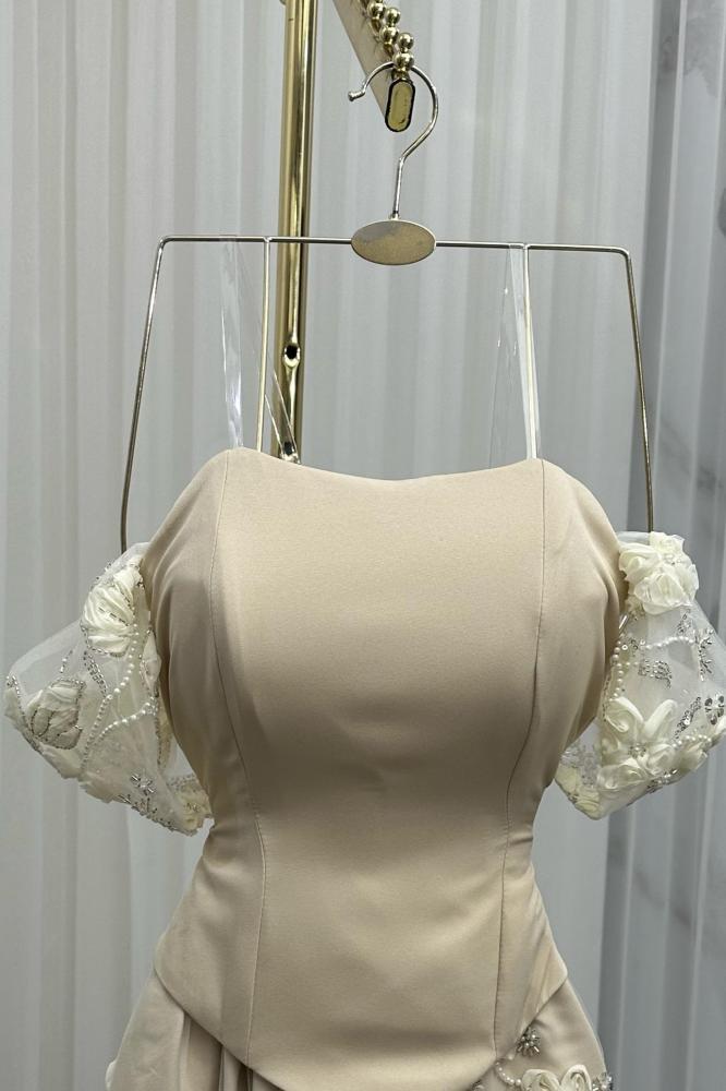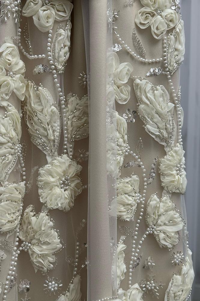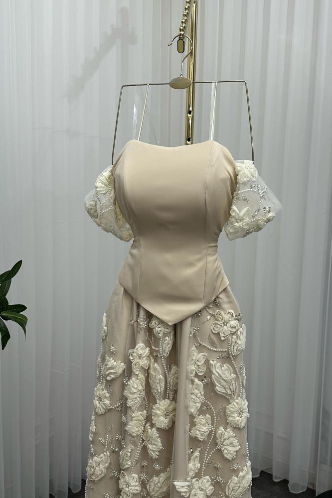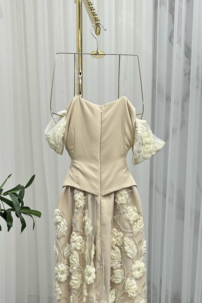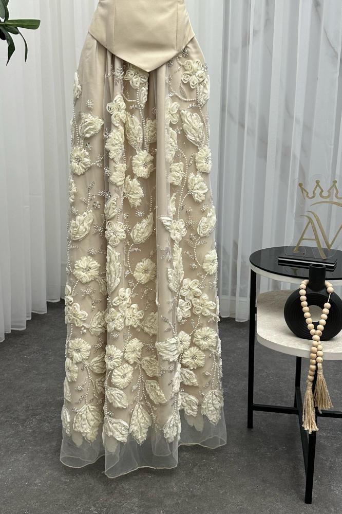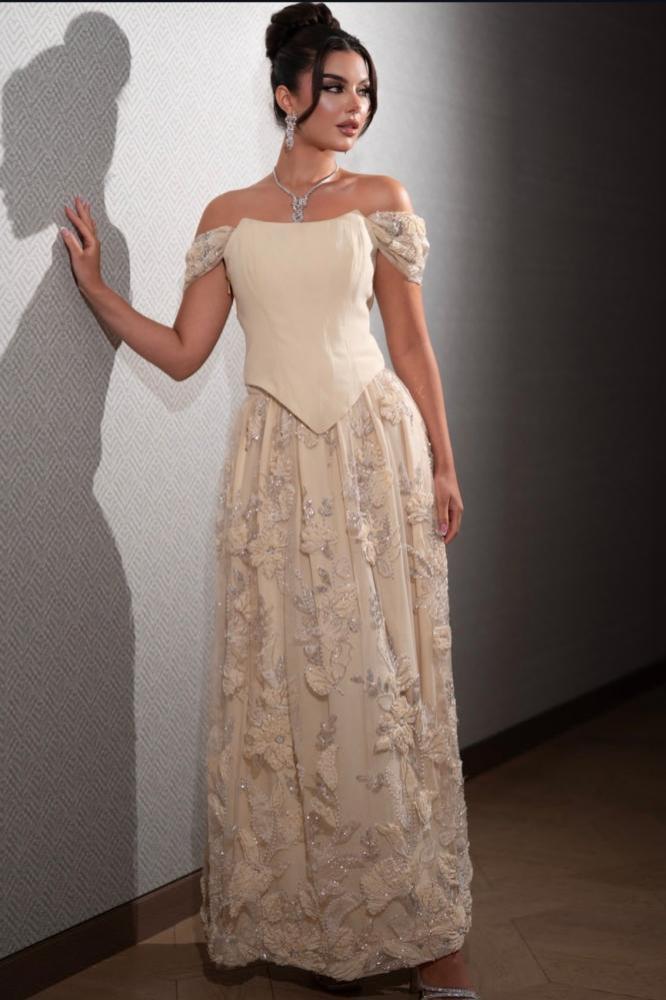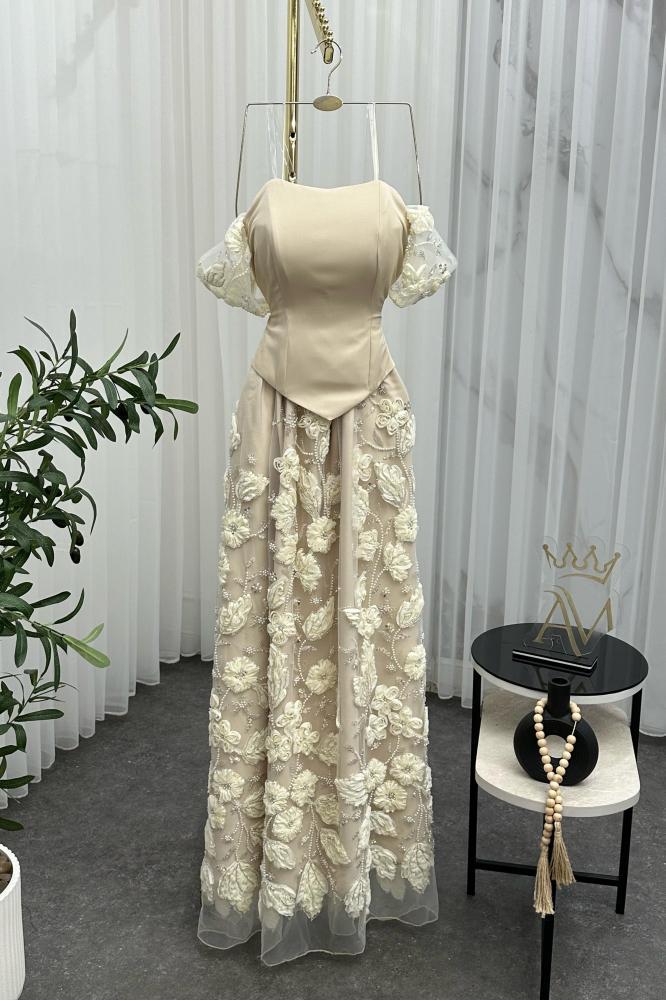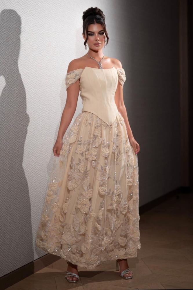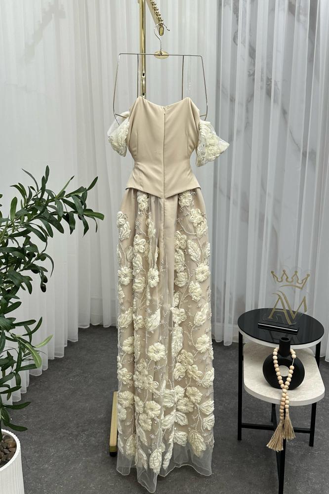 فستان طويل وأنيق، بلون بيج فاتح. الجزء العلوي من الفستان ضيق ويحتوي على أكتاف مكشوفة مع أكمام قصيرة مزينة. الجزء السفلي من الفستان واسع ومزين بتطريزات وزخارف على شكل زهور وأوراق، مما يضفي عليه لمسة فاخرة وجميلة