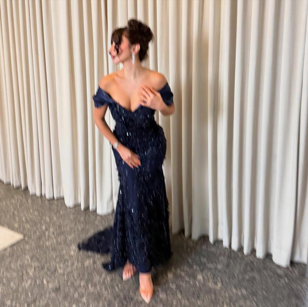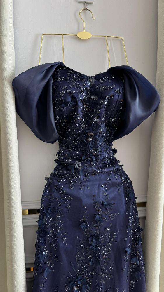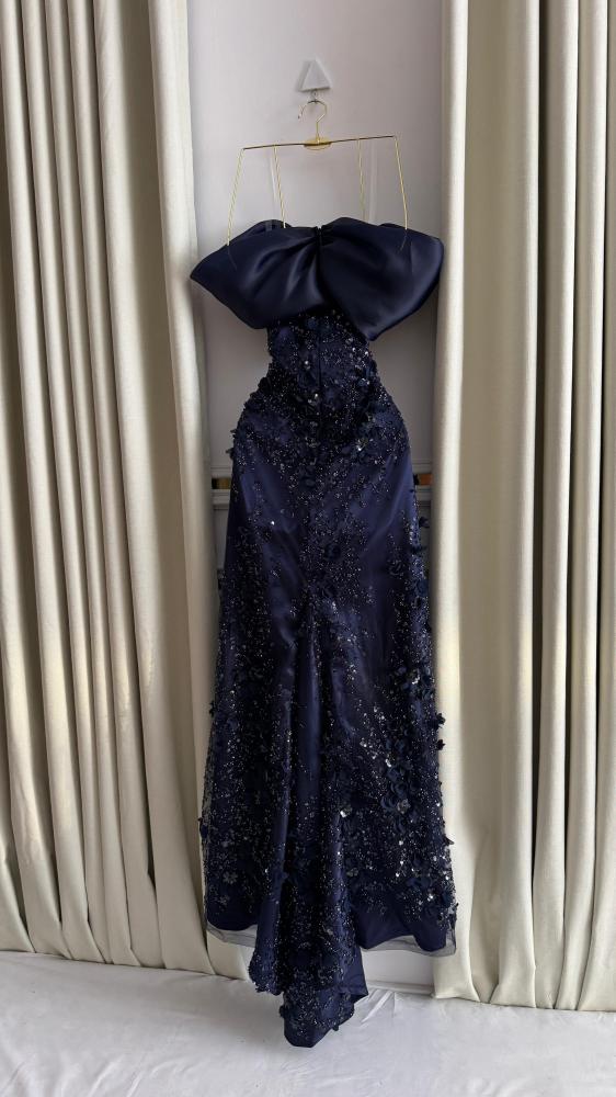 فستان سهرة كحلي فخم بتصميم فريد.