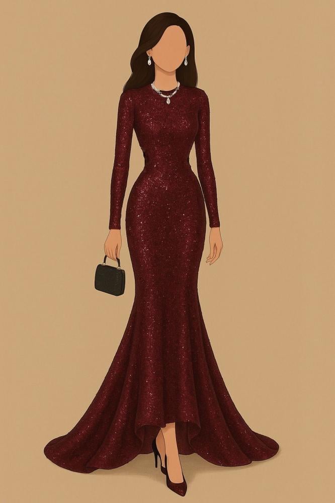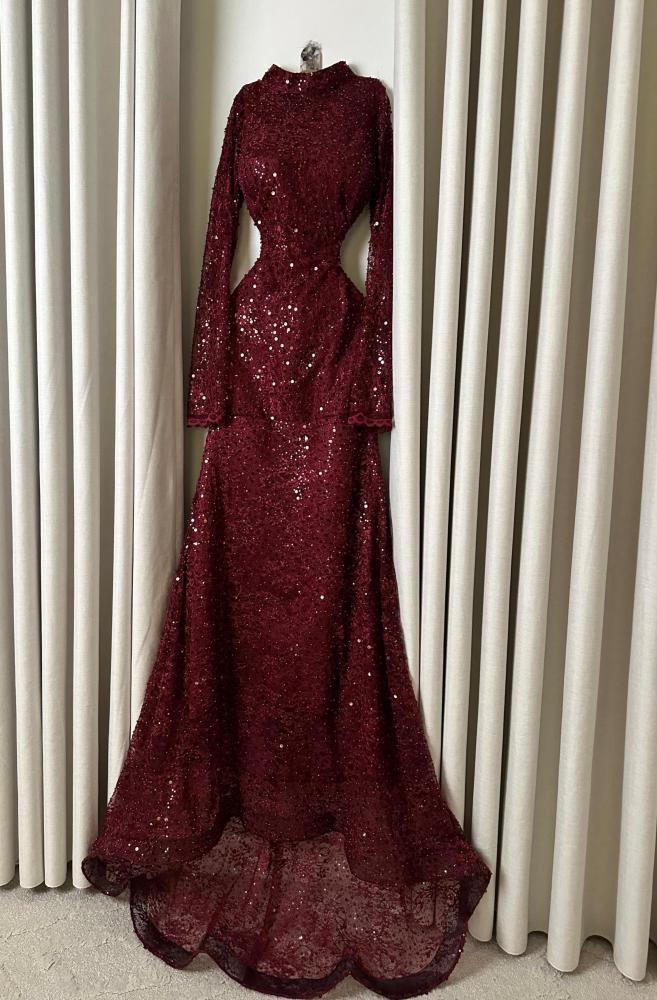 فستان يتميز بفخامة وأناقة اللون خمري الفستان مزين بالكامل بالترتر اللامع أكمام طويلة وياقة مرتفعة قصة ضيقة عند الخصر وذيل بسيط من خلف الفستان.