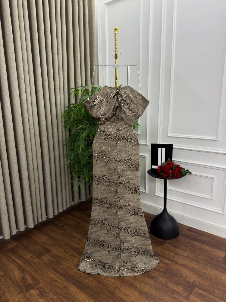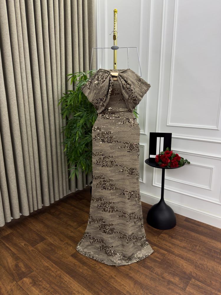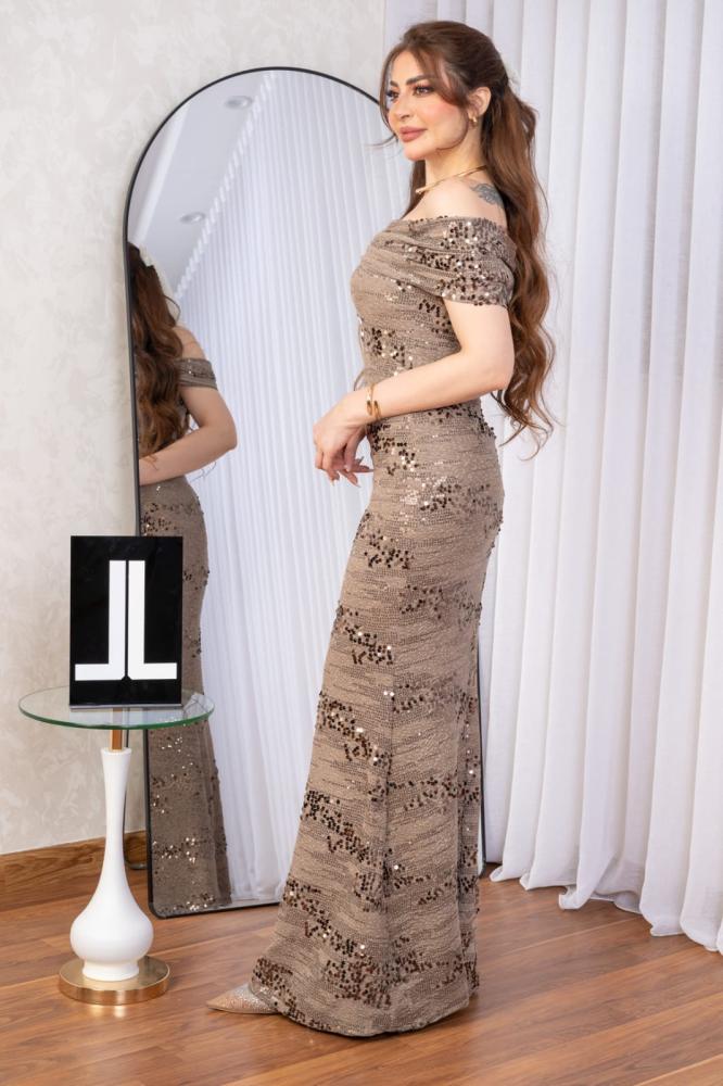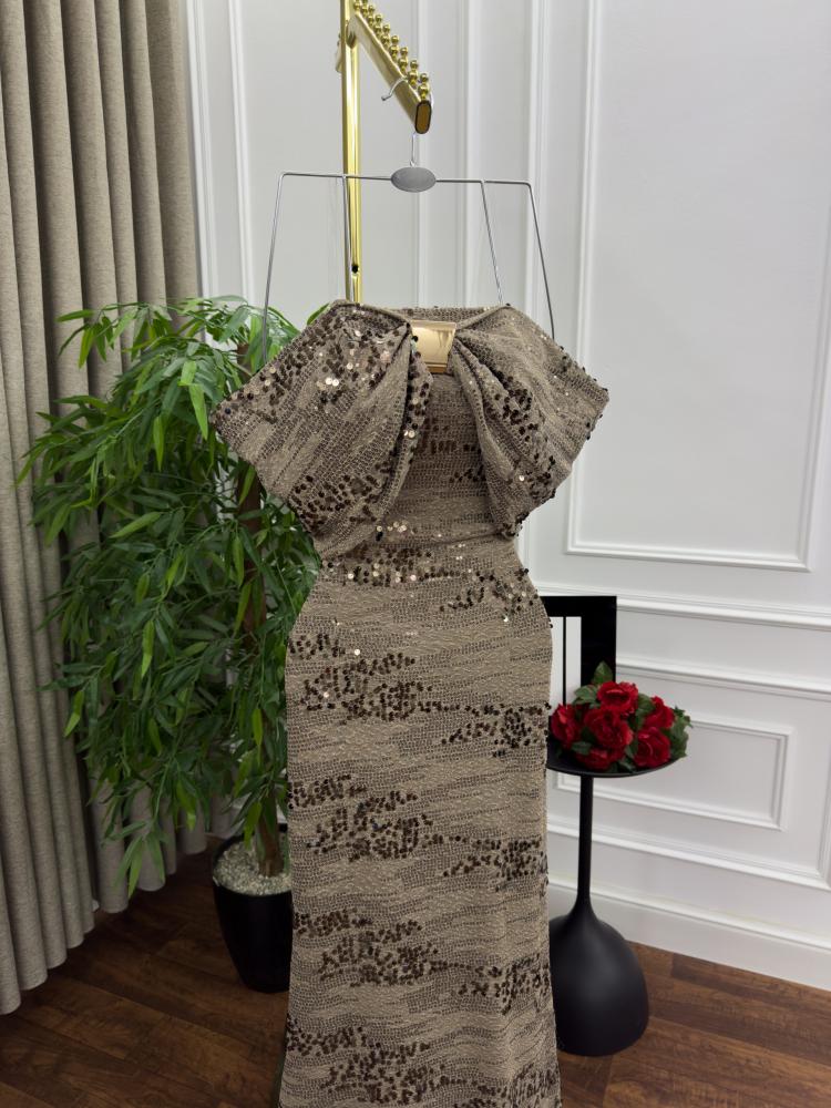 يتميز الفستان بتصميم من قطعتين: فستان داخلي بقصة مستقيمة ضيقة على الجسم، و جاكيت قصير (بوليرو) منفصل بتصميم منفوخ و مزين بترتر ذهبي على شكل فيونكة. الفستان مزين بالكامل بالترتر اللامع الذي يضفي عليه بريقًا مميزًا. مثالي للسهرات والمناسبات الخاصة