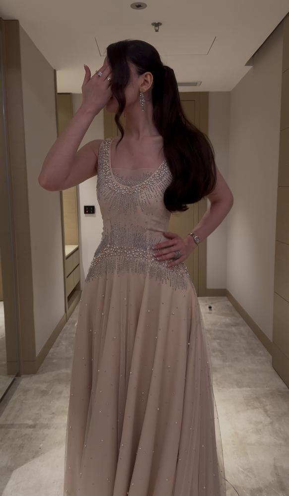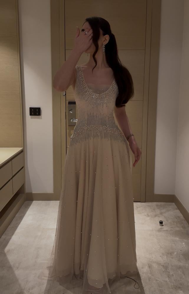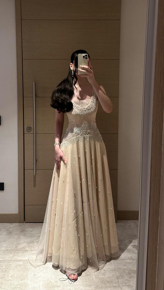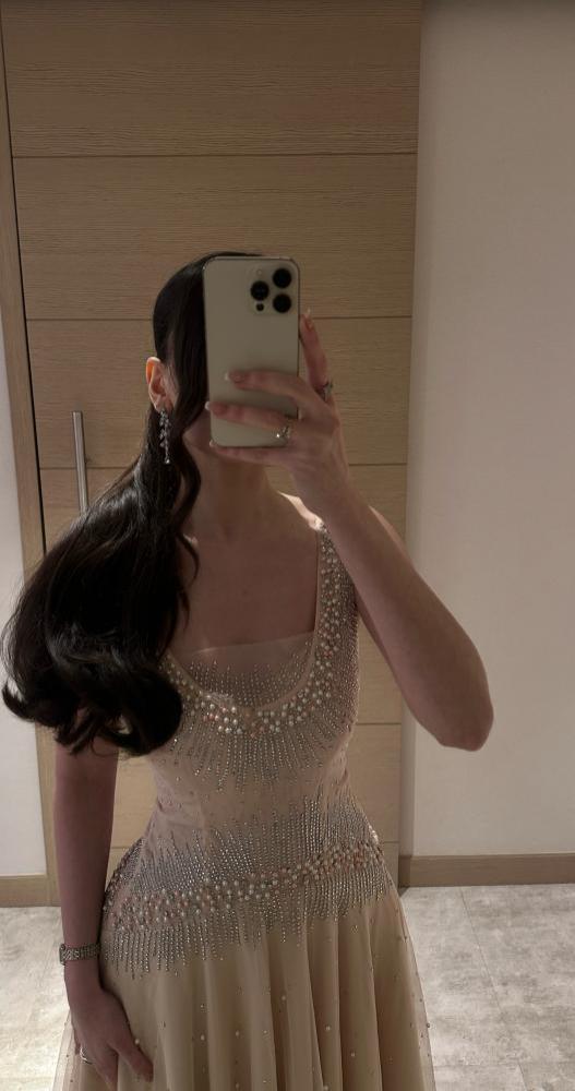 مزين بالكامل باللؤلؤ والخرز الفضي على الصدر والخصر، مع تنورة من التول المنقط باللؤلؤ