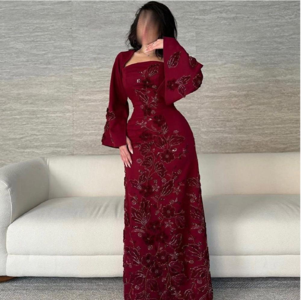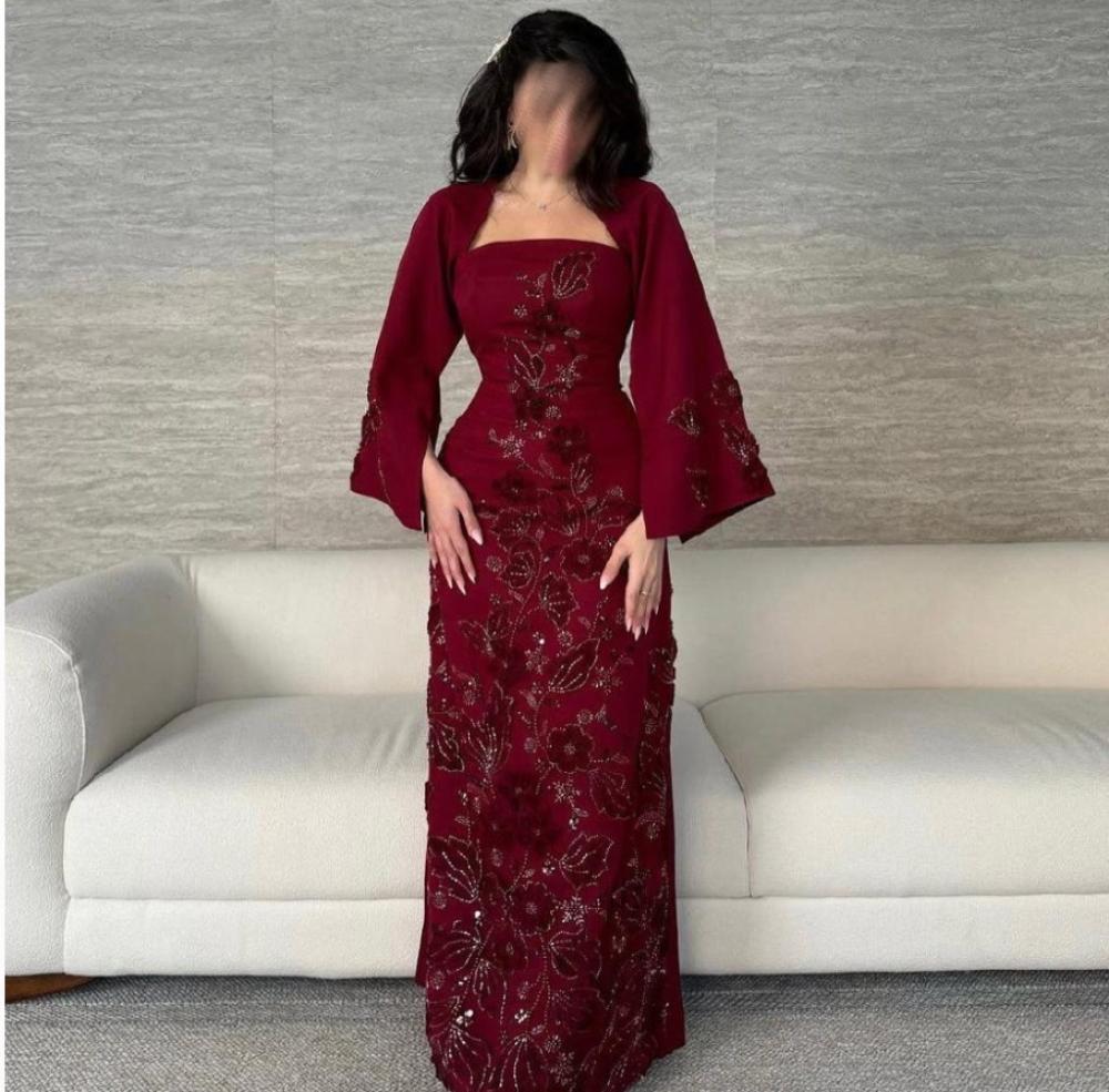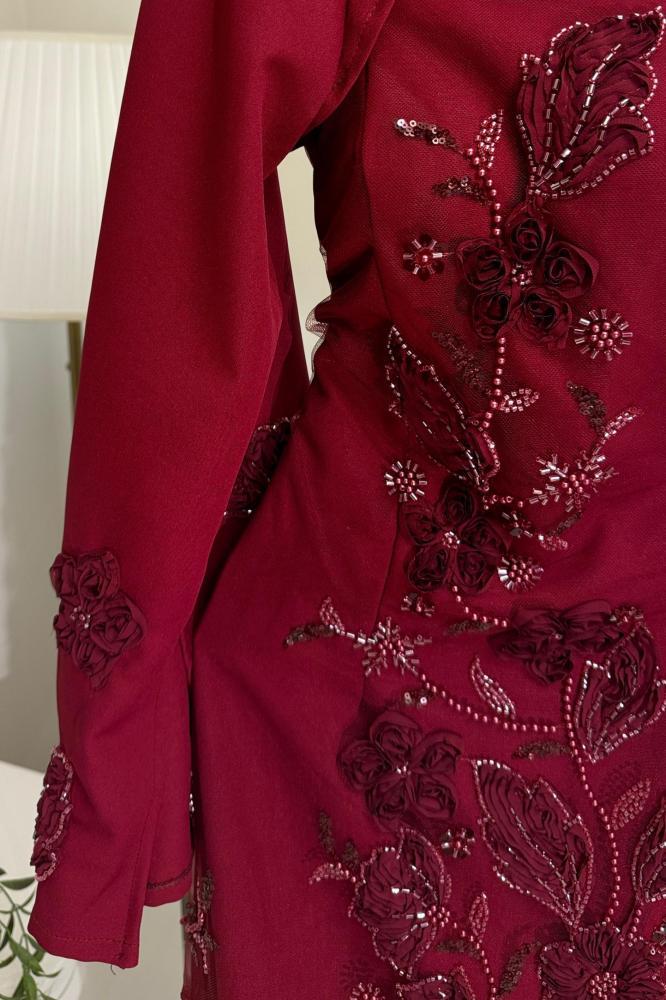 فستان طويل بلون خمري، مصنوع من قماش مزخرف بتطريزات زهرية لامعة. الأكمام واسعة وطويلة، وتنتهي بتطريزات مشابهة لتلك الموجودة على الفستان. الفستان ضيق عند الخصر وينسدل بشكل مستقيم حتى الأرض